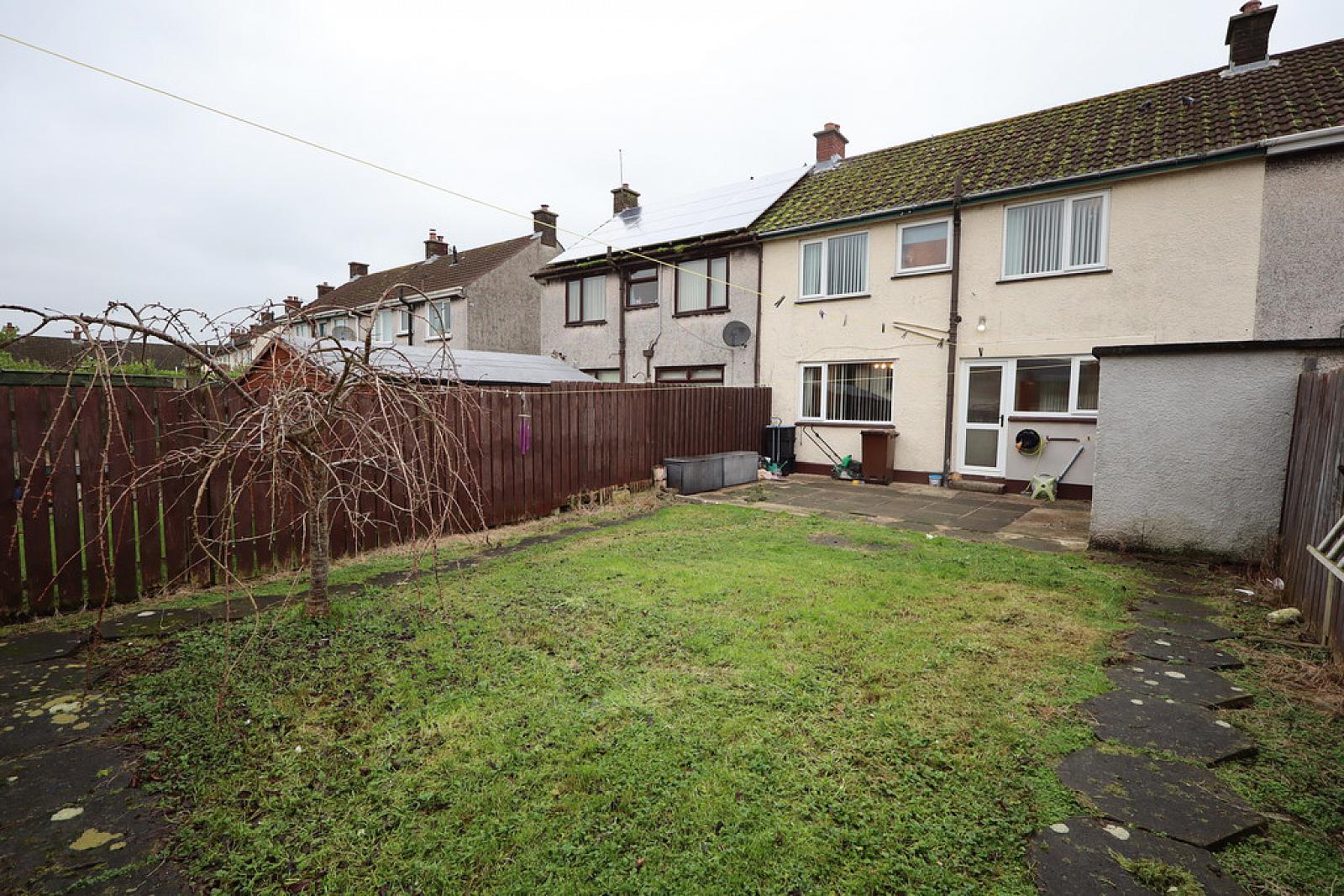 Enclosed garden to rear with paved patio area, laid in lawn, storage shed/outbuilding, outside light, outside tap.