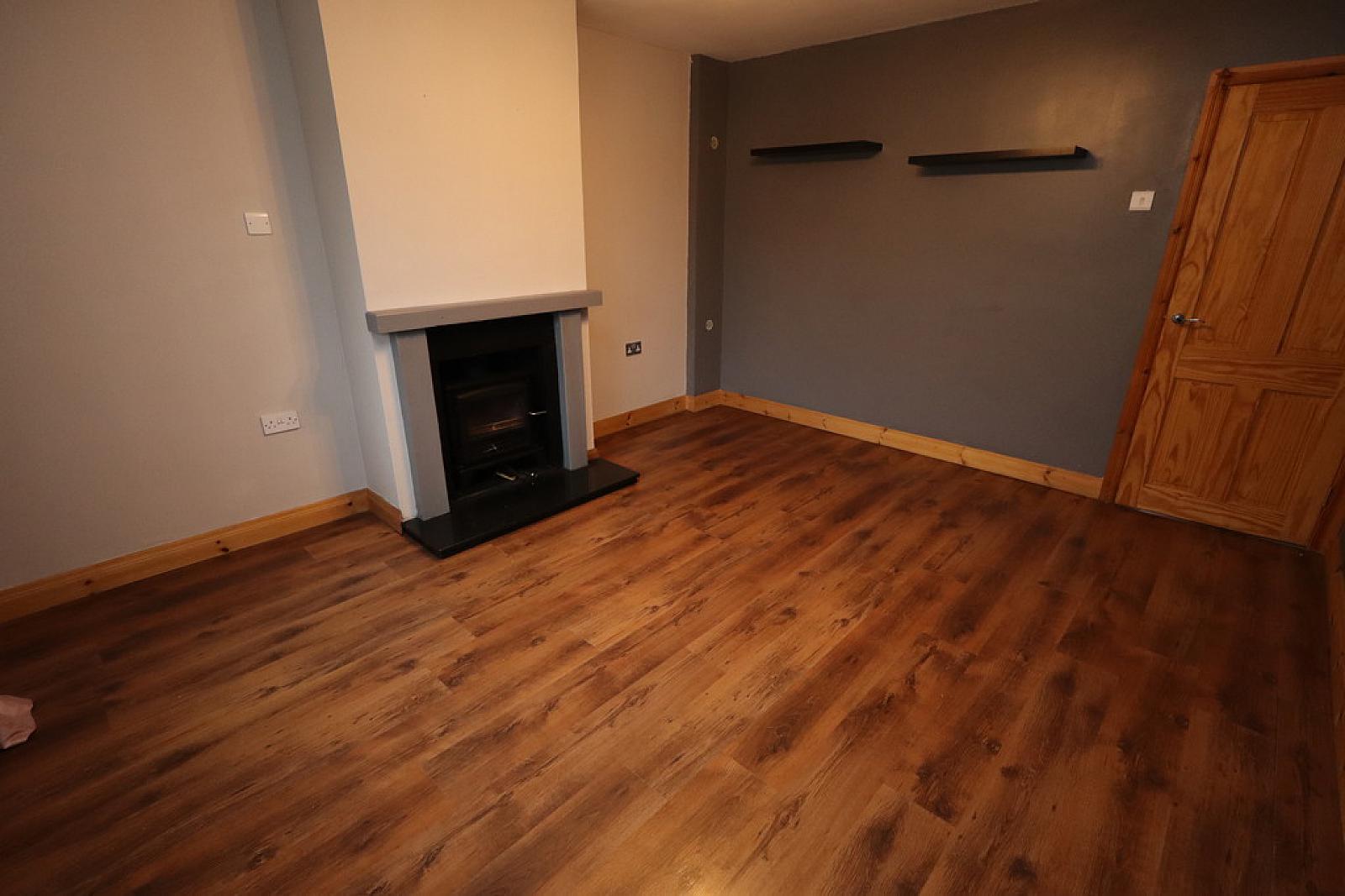 LIVING ROOM 14' 04" x 11' 11" (4.37m x 3.63m) Feature wood-burning stove with tiled fireplace, wood effect laminate flooring.