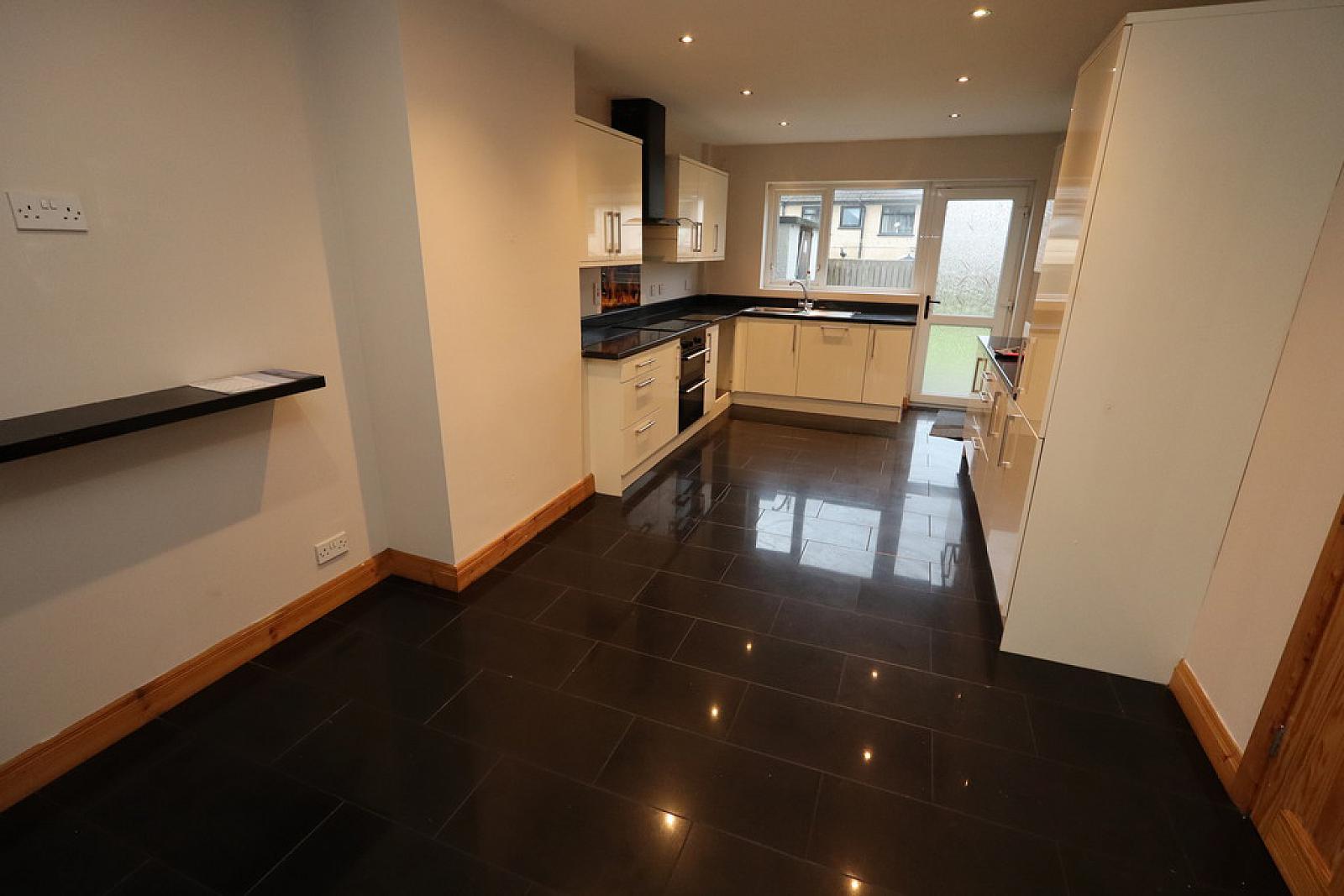 KITCHEN/DINER 27' 00" x 10' 04" (8.23m x 3.15m) Gloss fitted kitchen with contrasting round edge work surfaces, single bowl stainless steel sink unit with drainer and mixer tap, built in fan assisted oven, built in hob with overhead extractor canopy, built in fridge freezer, built in dishwasher, plumbed for washing machine. granite tiled flooring.