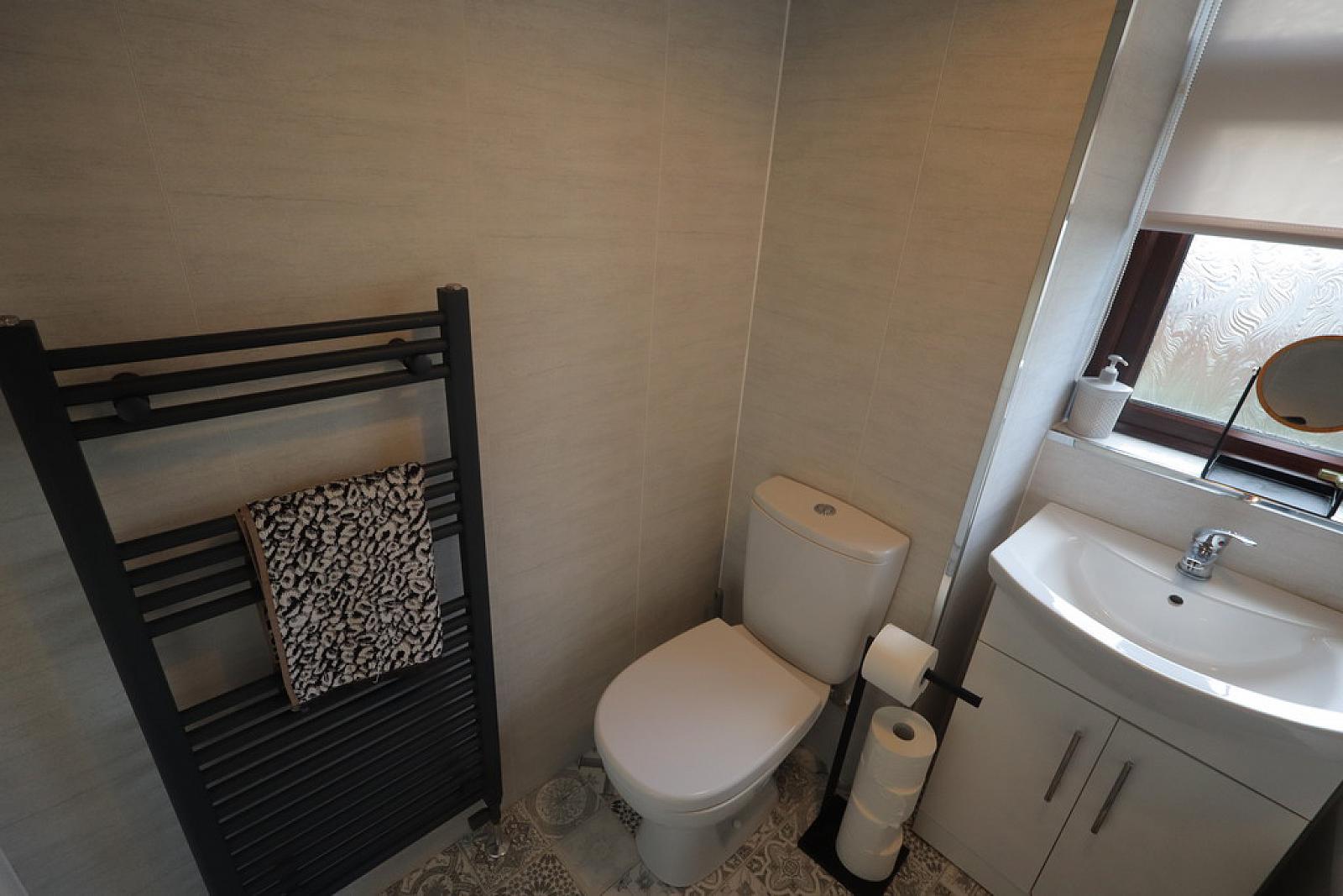 BATHROOM uPVC bath unit, electric shower, glazed shower screen, vanity sink unit, low flush W/C, PVC panelled walls and ceiling, heated towel rail, laminate effect tiled flooring