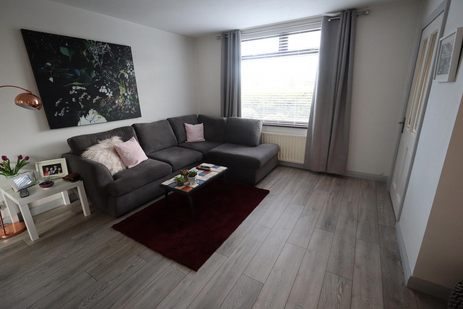Lounge with laminate wood flooring