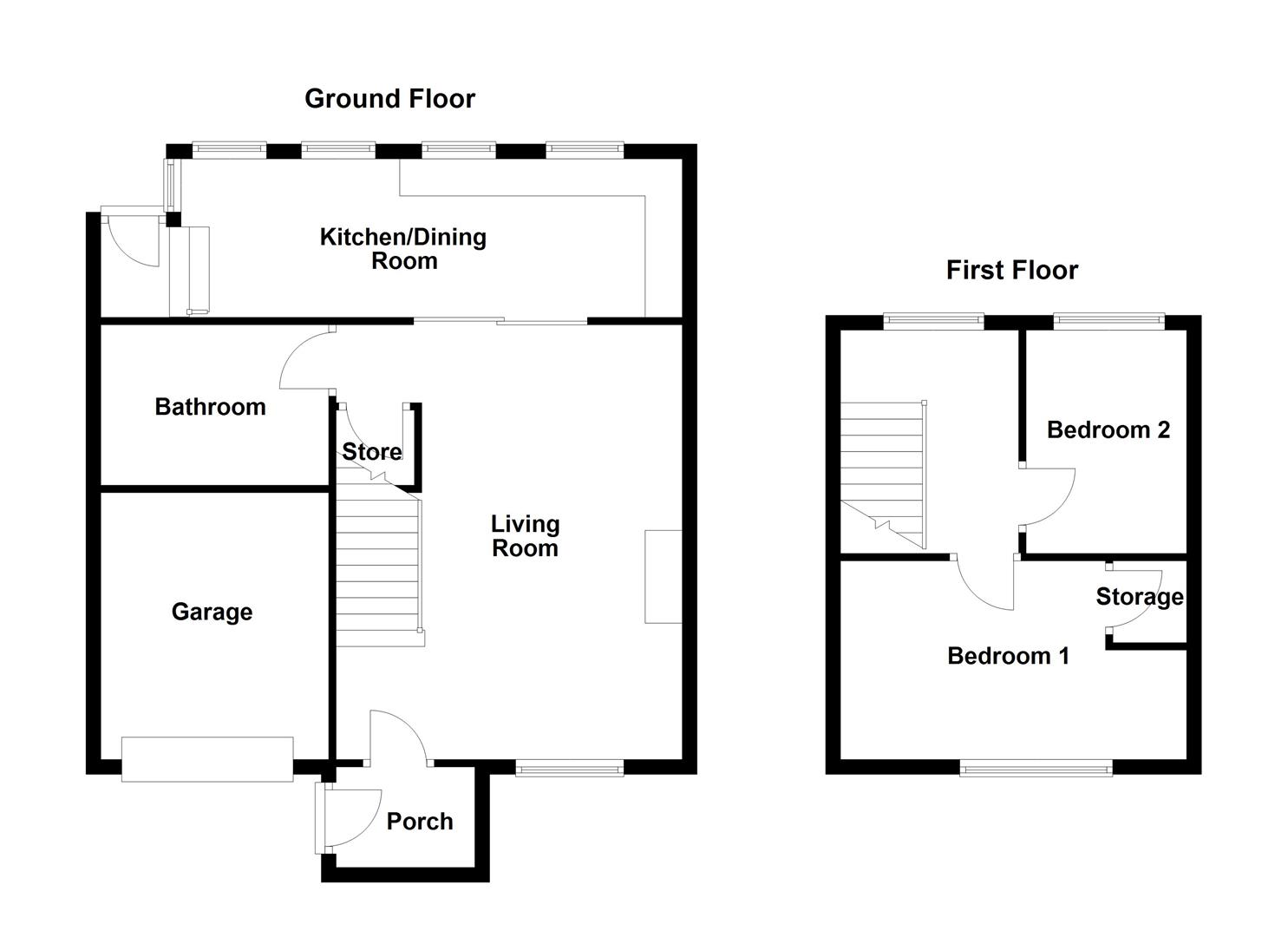 The property includes a living room with an open fireplace, a spacious kitchen/dining area with scope for updating, two well-proportioned bedrooms, and a ground floor bathroom.