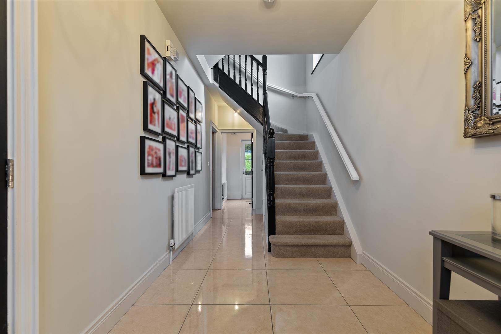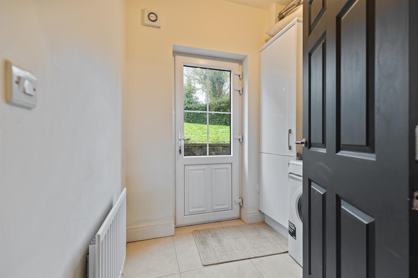 On entering, a tiled entrance hall provides access to the snug, utility room, and integral garage. The snug features a tiled floor and double doors leading to the rear garden, while the utility room is fitted with high and low level units, a stainless steel sink, space for a washing machine, and rear garden access. The garage has power, light, and an up-and-over roller door.