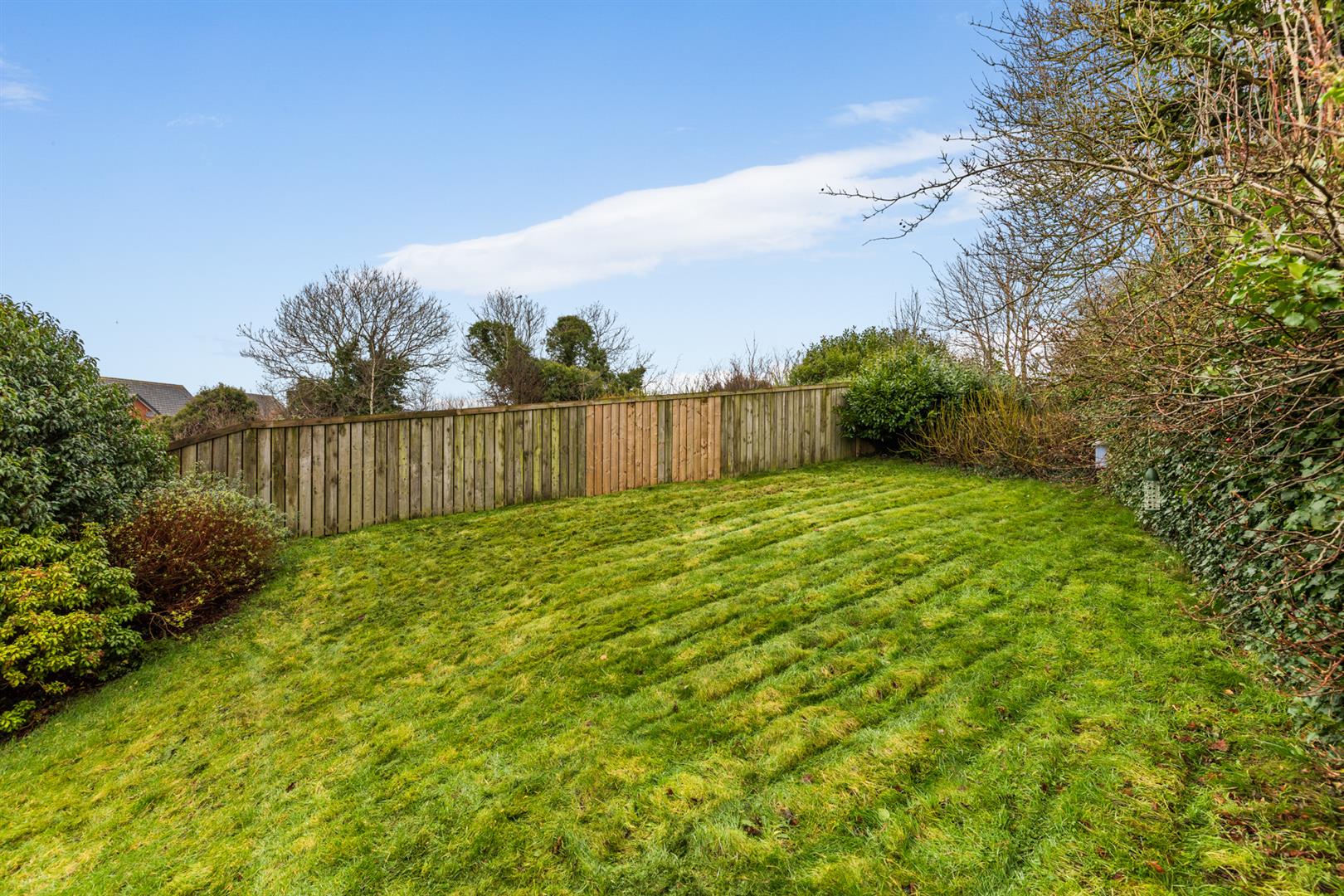 Rear: Fully enclosed area in lawn, mature shrubs and hedges, paved area, large composite decking area.