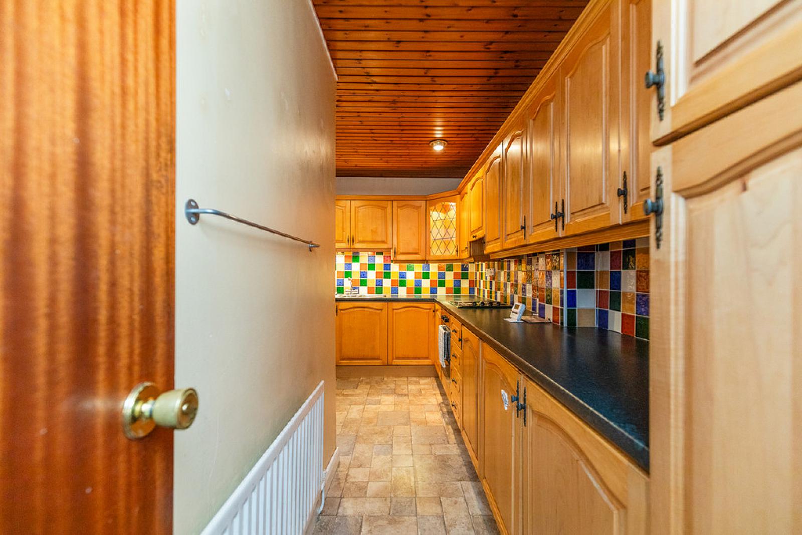KITCHEN 15' 4" x 7' 7" (4.69m x 2.33m) Range of high and low level units, feature under lighting, glazed display cabinet, integrated oven and hob and extractor fan over, integrated under counter fridge and freezer, stainless steel sink unit, tongue and groove ceiling, partly tiled walls.