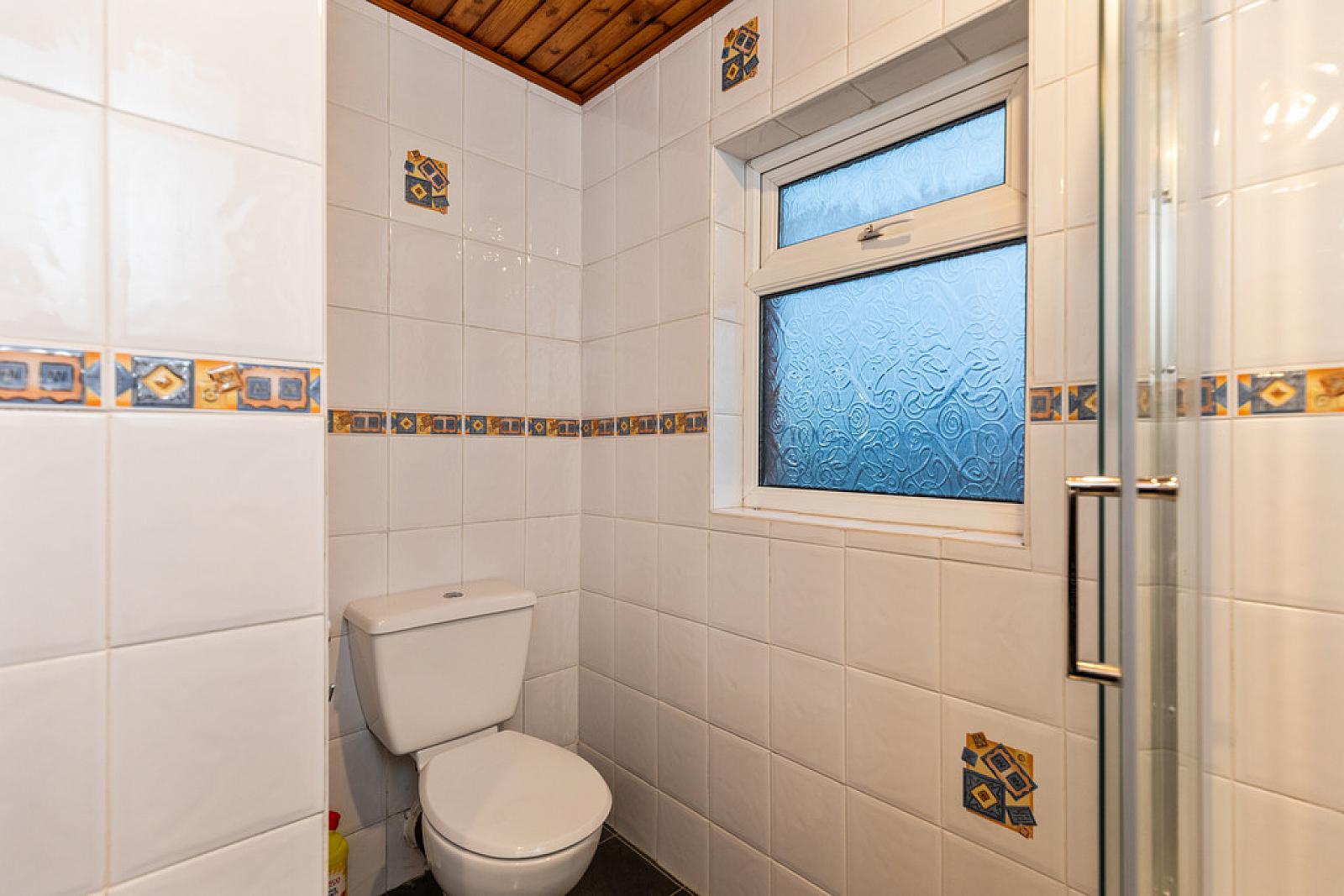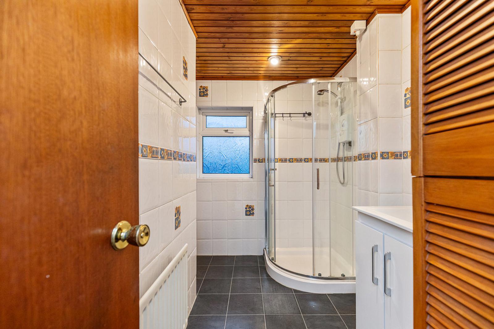 SHOWER ROOM Fully tiled shower cubicle with electric shower, wash hand basin with chrome taps and storage, low flush w.c, linen closet, fully tiled walls, tongue and groove ceiling.