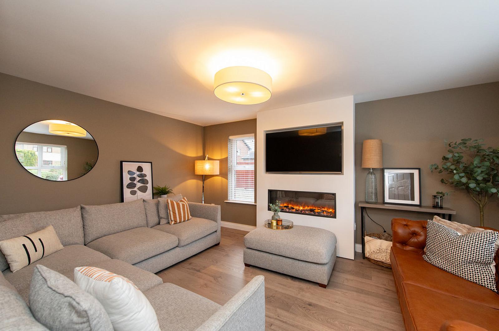 LOUNGE 15' 7" x 11' 9" (4.75m x 3.58m) Laminate wood flooring, media wall wired for flat screen, feature electric fire