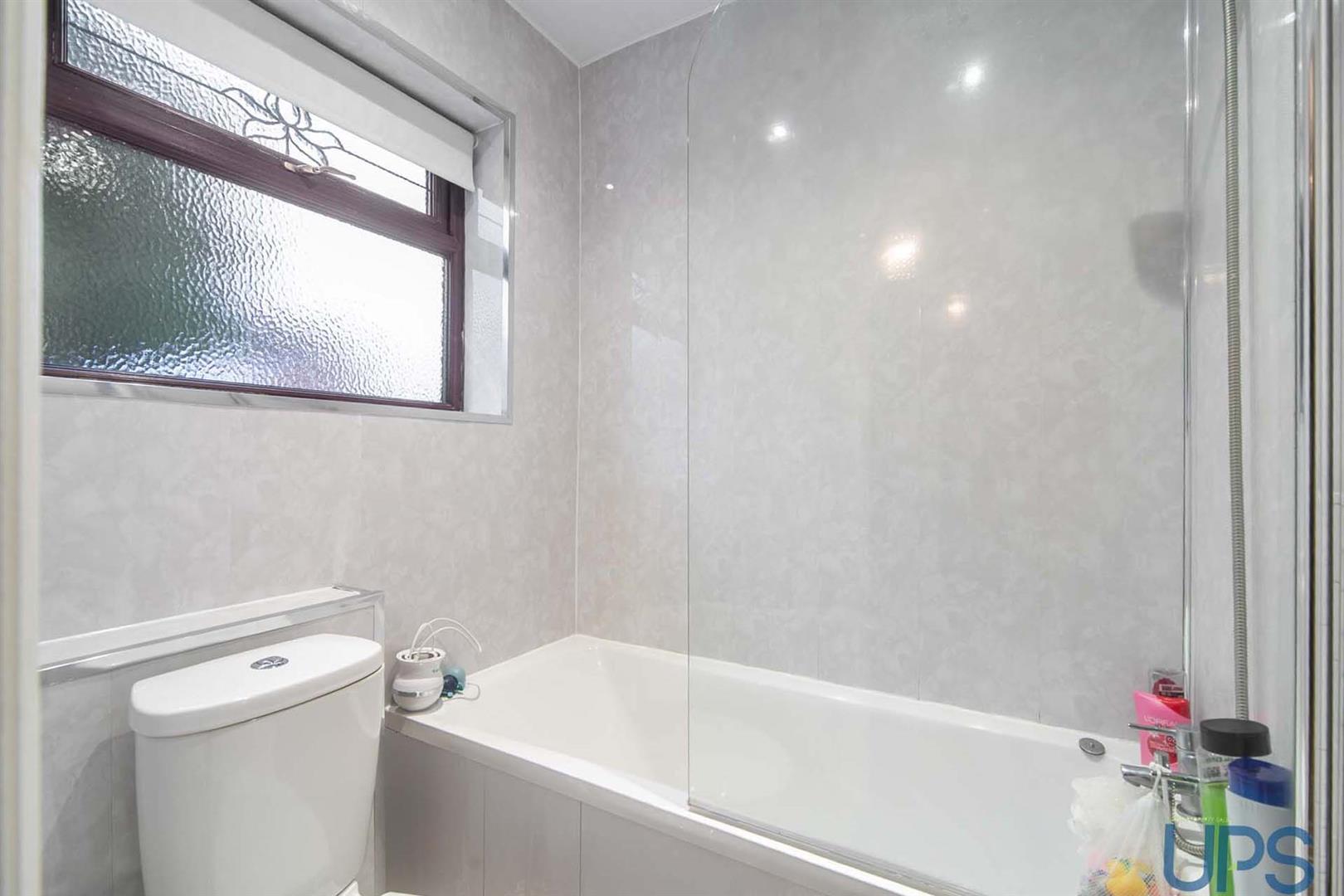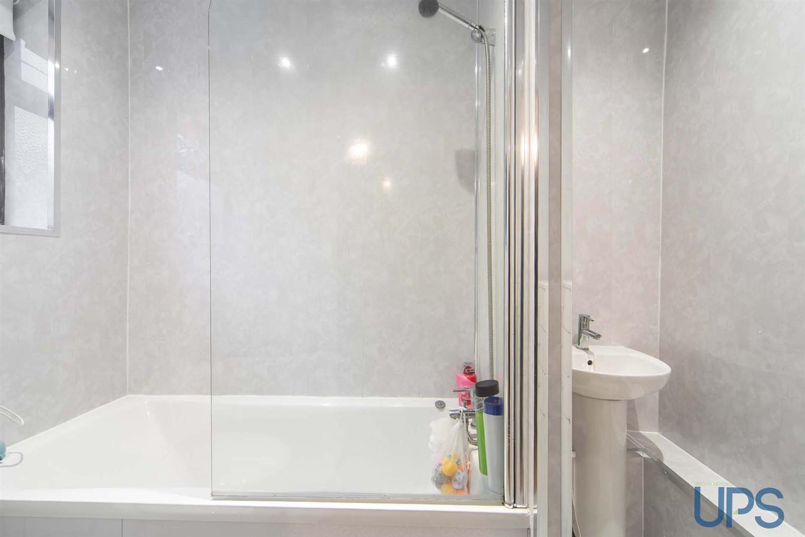 Panelled bath, telephone hand shower, shower screen, low flush w.c, pedestal wash hand basin, chrome effect sanitary ware, pvc wall coverings, downlighters.
