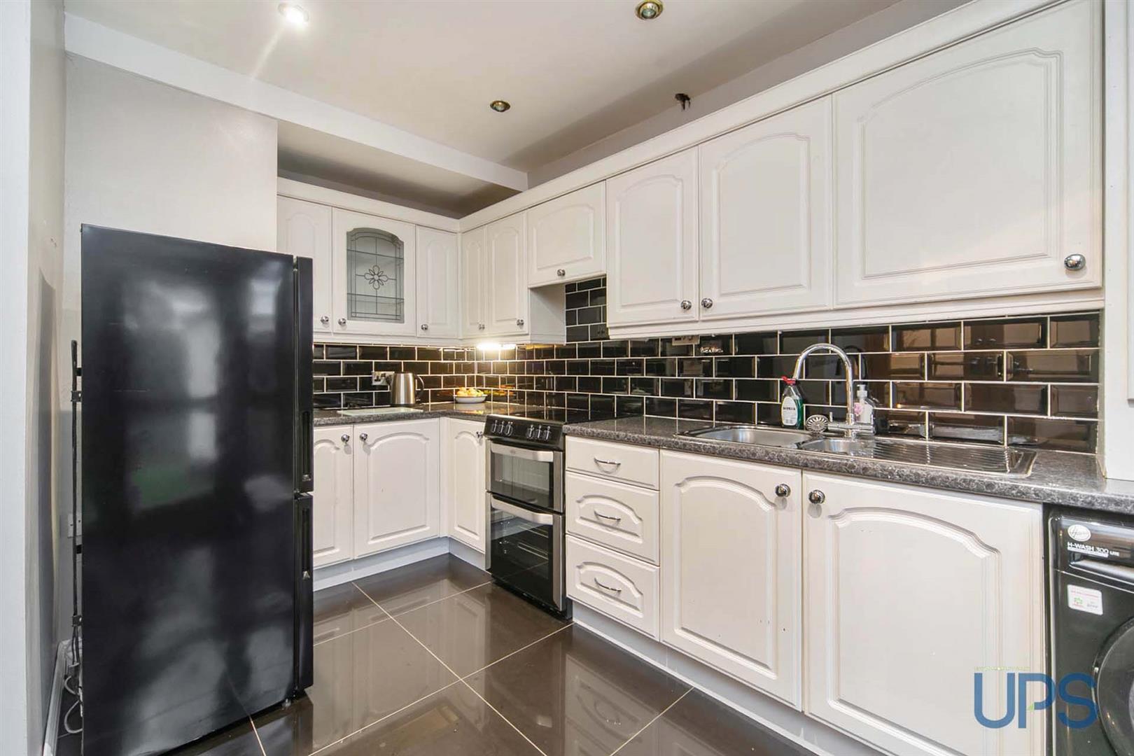 Range of high and low level units, formica work surfaces, tiling, porcelain tiled floor, downlighters, single drainer stainless steel sink unit, Upvc double doors, Worcester boiler. Upvc double glazed back door.