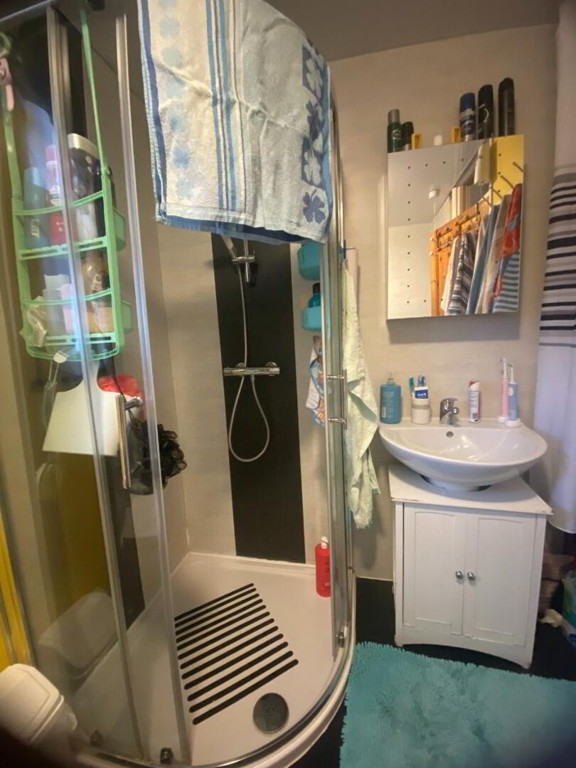 2.19m x 1.69m (7' 2" x 5' 7") 4 piece white suite comprising, low flush WC, pedestal wash hand basin, panel bath, walk in shower cubicle, PVC ceiling & part walls, double panel radiator, slate effect laminate flooring.