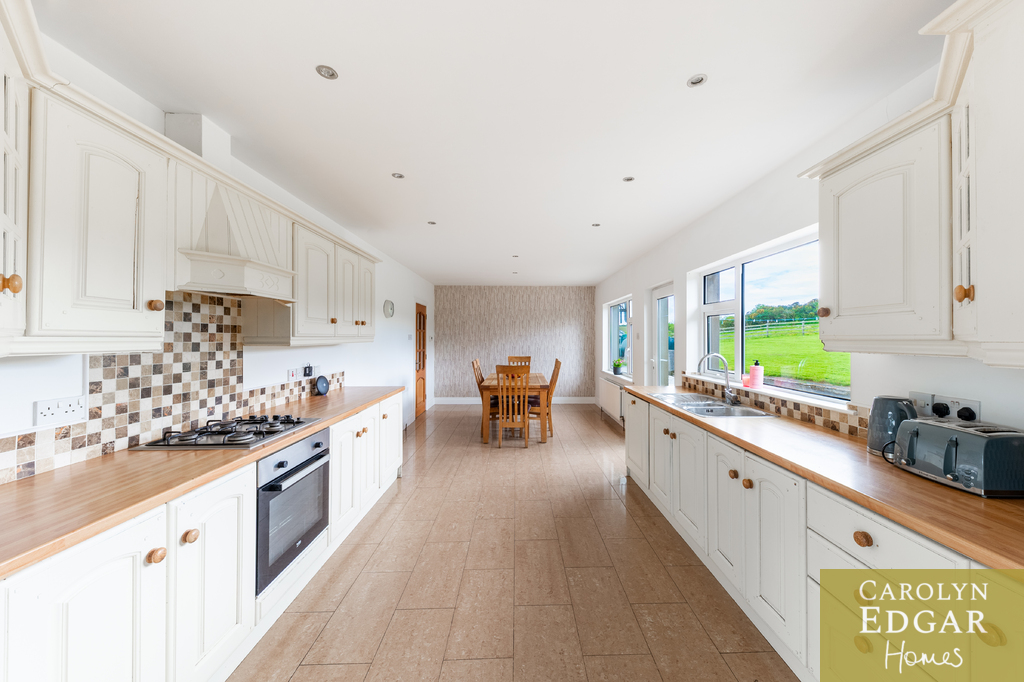 Internally the property comprises of bright entrance hallway, spacious lounge, overlooking the gardens with feature open fireplace, modern open plan kitchen with casual dining area leading out sunroom with views over the well-maintained gardens The property has five double bedrooms as well as contemporary bathroom and handy utility room. Outside the property has gated driveway and parking area for horse lorry or horse box, with separate access to extensive workshop/storage, tack room and six stables. The property comes with approximately five acres and carpet gallop providing a great opportunity not only to buy a home but with all the capacity for your equestrian needs that comes with it too.