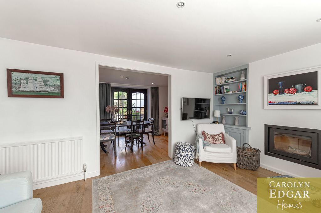 Ground Floor Large Cosy Lounge with Feature Wall Mounted Stove Open to Dining Room