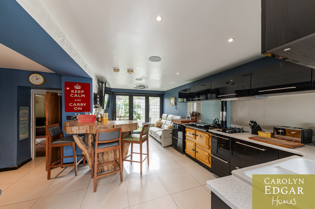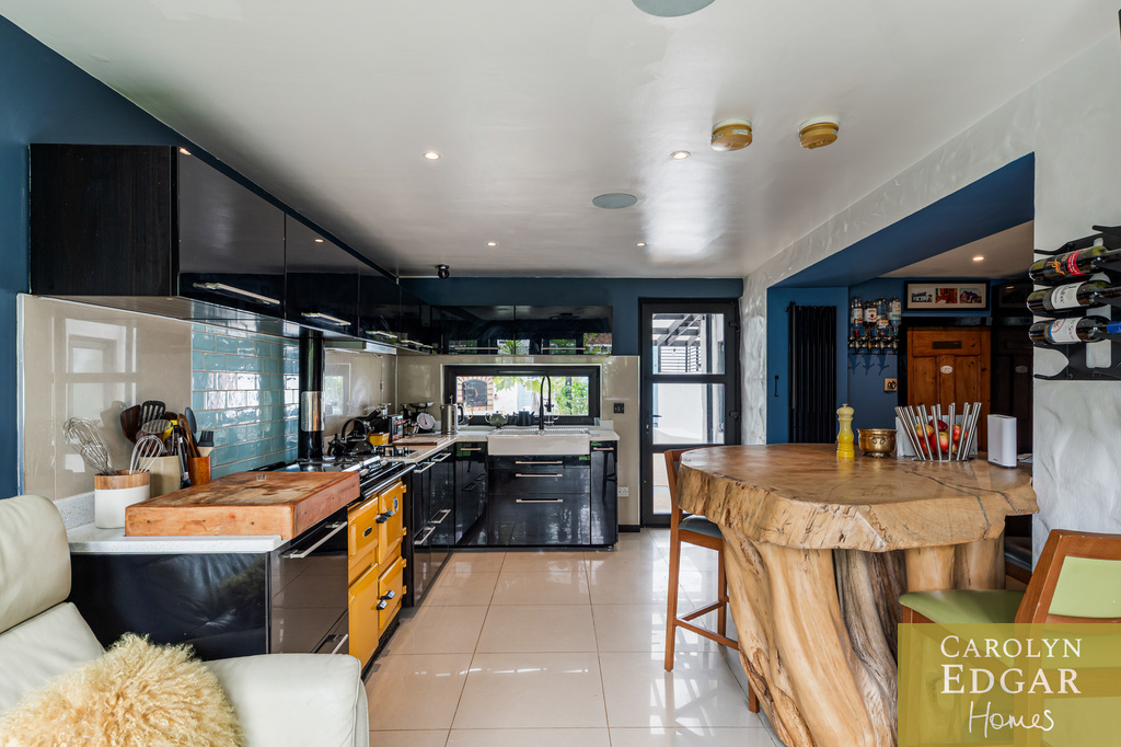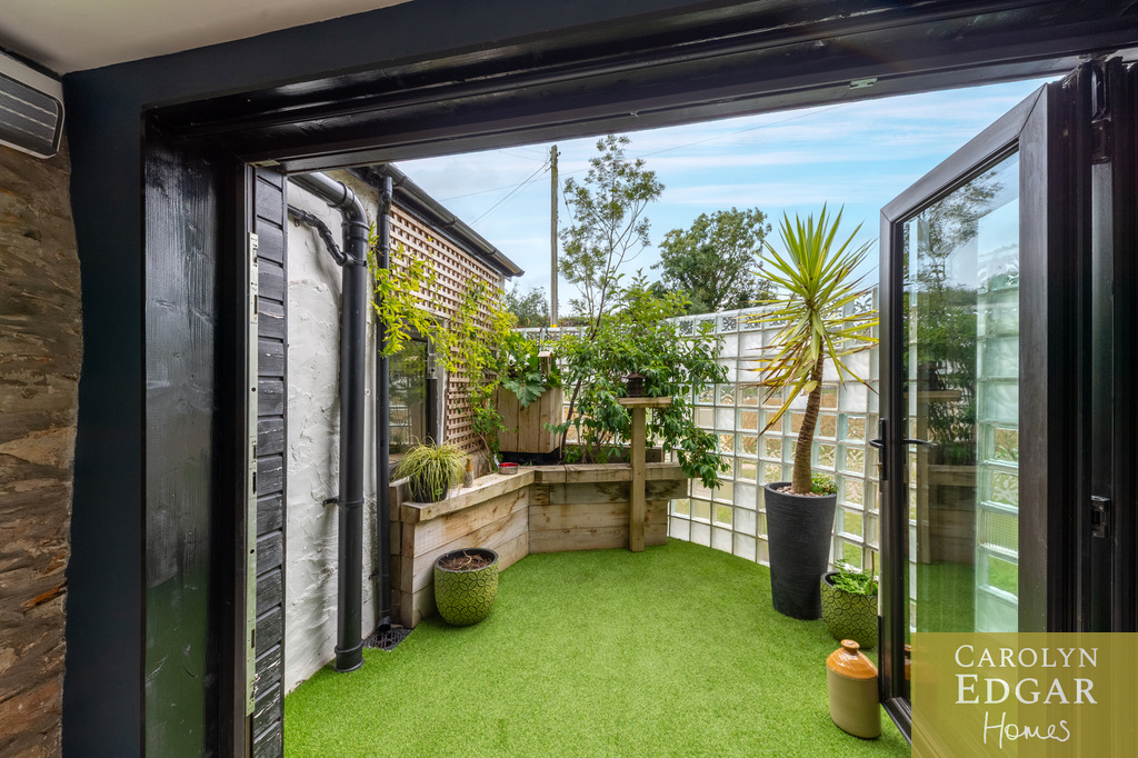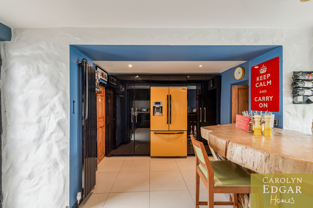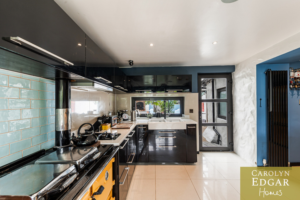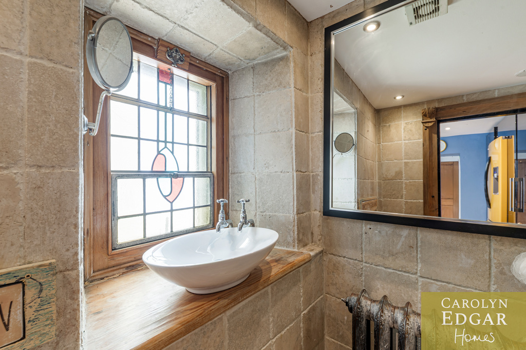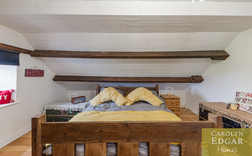 Internally, the cottage comprises of bright entrance porch, spacious lounge overlooking the gardens with original exposed timber ceiling beams and a cozy inglenook fireplace, second reception room, previously used as a bedroom, again with garden views and featuring a hidden office/study area and open fireplace. The quirky modern open-plan kitchen with black gloss units and a striking yellow range cooker, complete with a feature tree stump breakfast bar is a contemporary contrast and is open to snug area with double doors leading out to small, enclosed garden/terrace. A fully stone tiled bathroom/wet room and large utility room with the original pump and enclosed courtyard complete the ground floor.