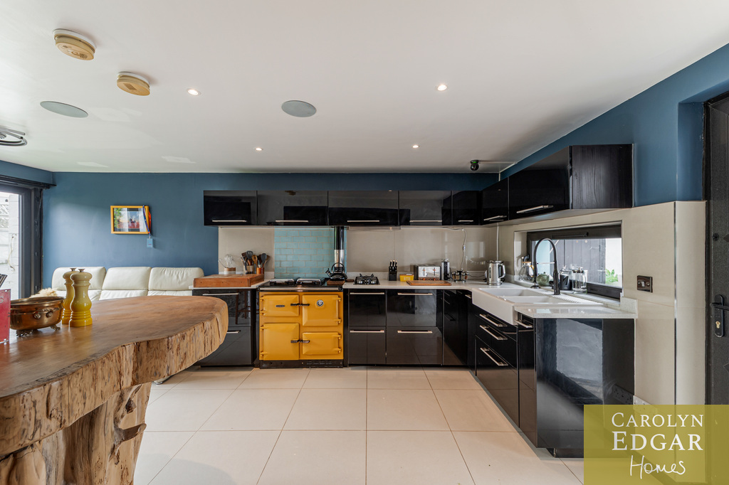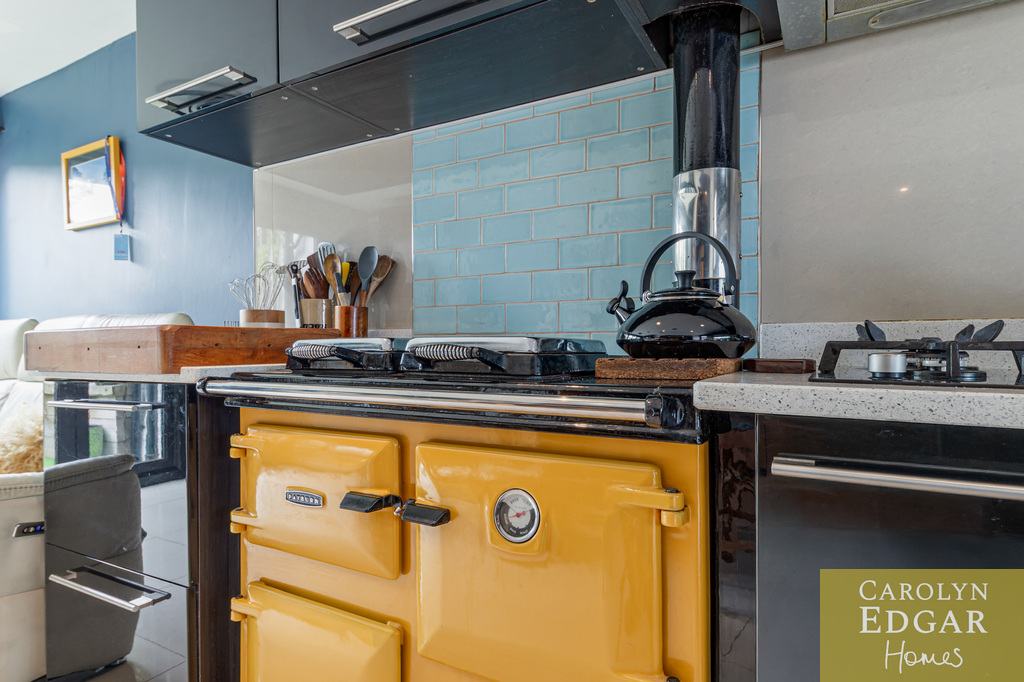 Contemporary Black Fitted Kitchen with Feature Yellow Fuel Aga