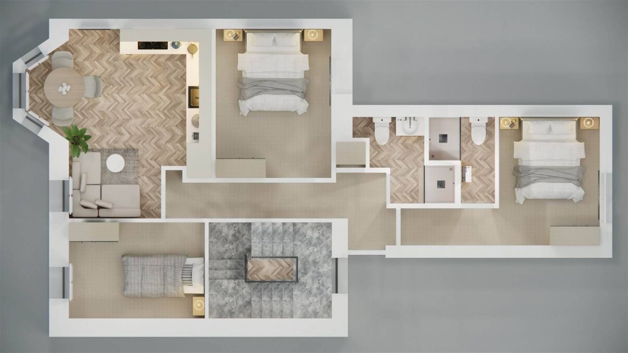Herringbone Wooden Flooring In Living Rooms & Carpets In Bedrooms