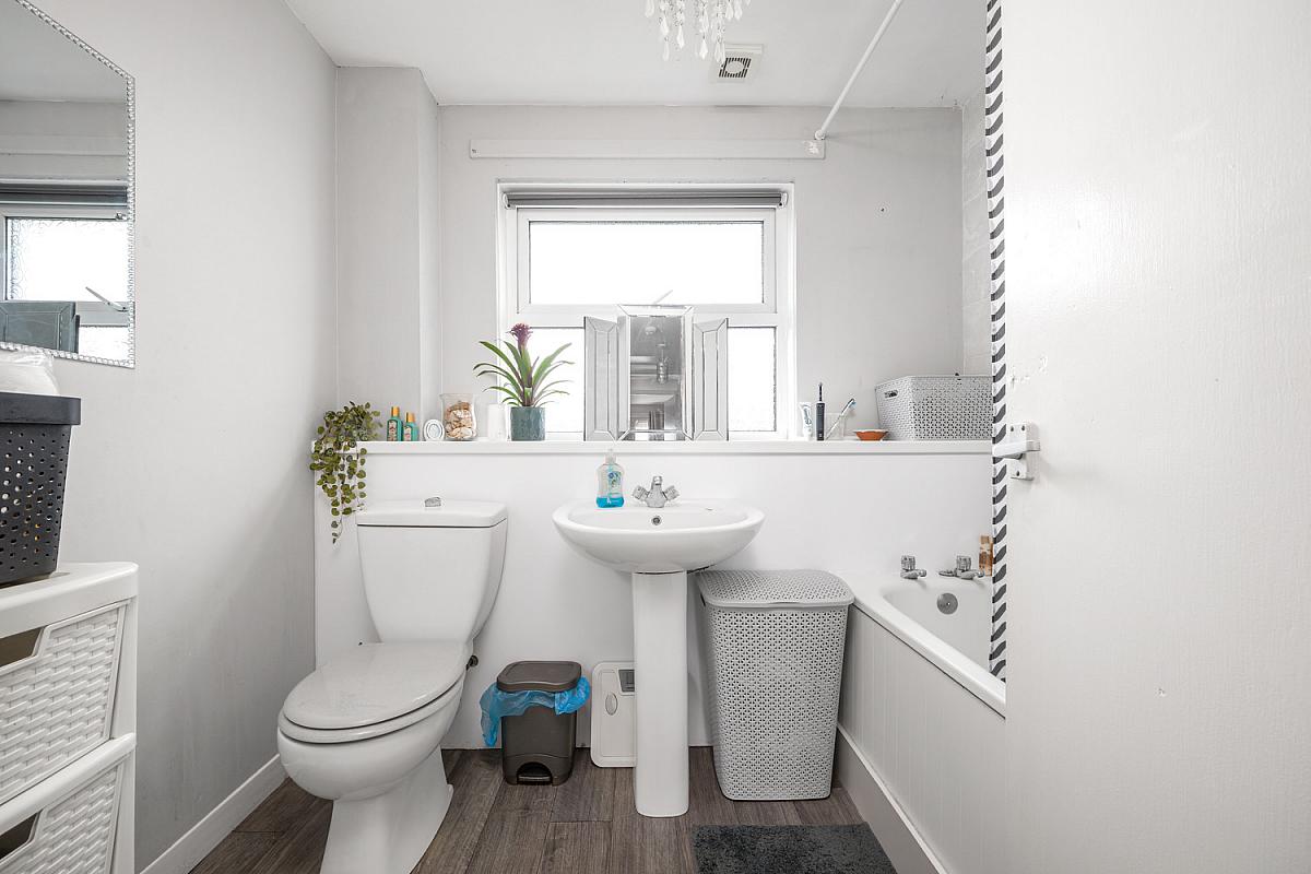 With white suite comprising w.c., wash hand basin, tiled surround bath with electric shower over and extractor fan.