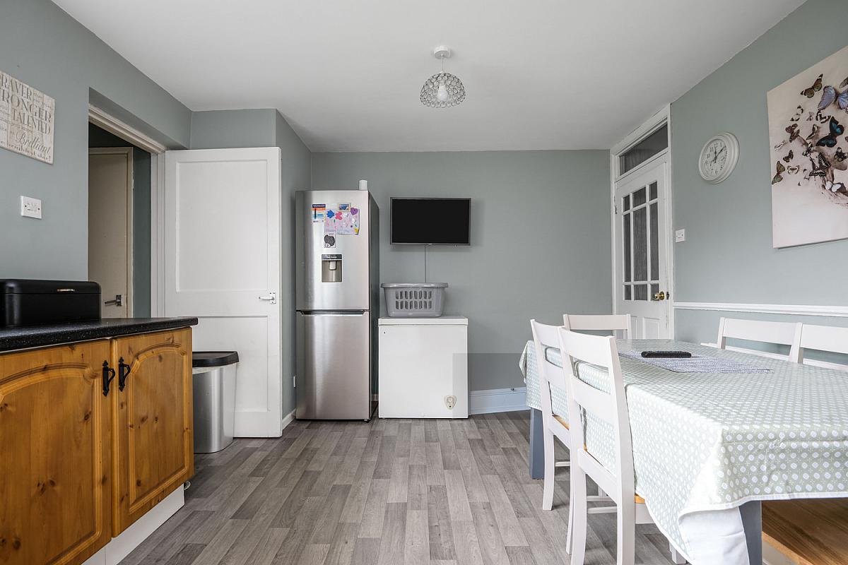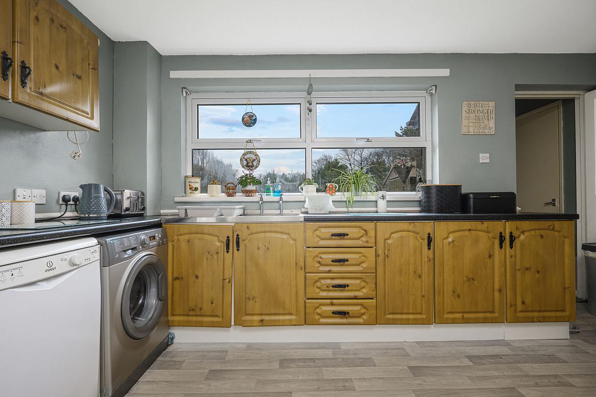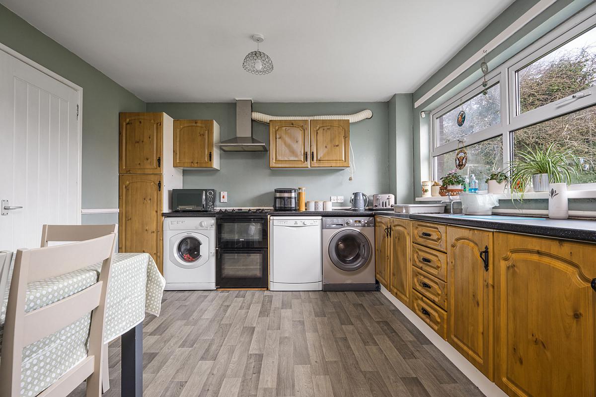 With single drainer stainless steel sink unit, high and low level built in units, integrated oven with stainless steel extractor fan above, plumbed for automatic washing machine and dishwasher, vented for tumble dryer, under stairs storage cupboard, drawer bank, dado rail and larder cupboard.