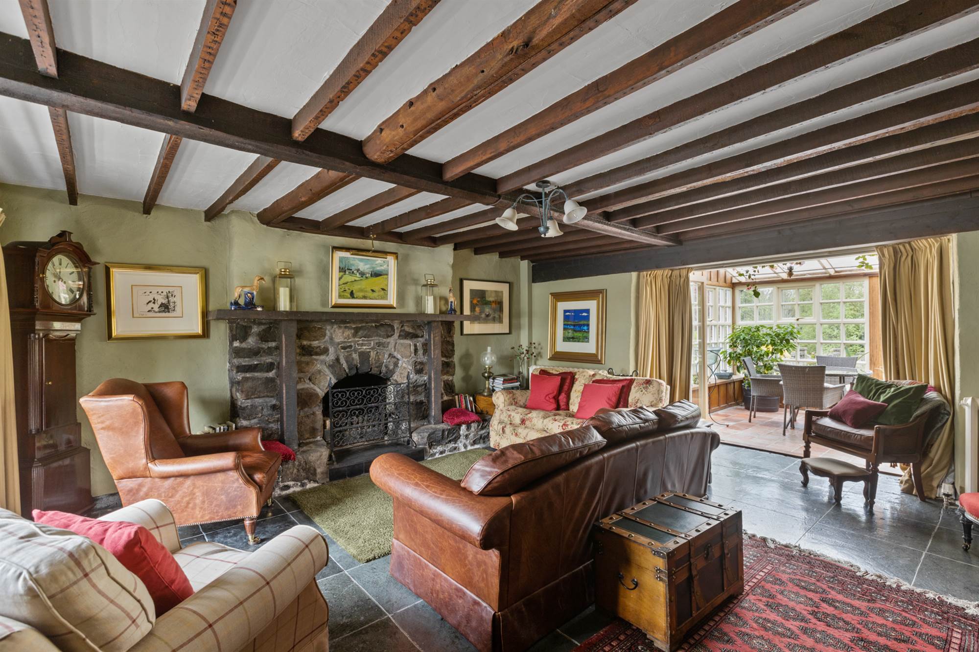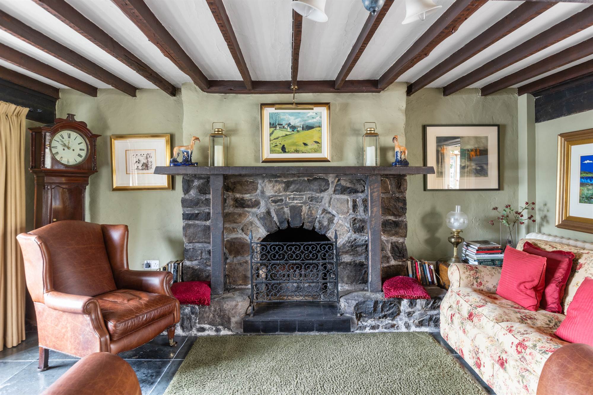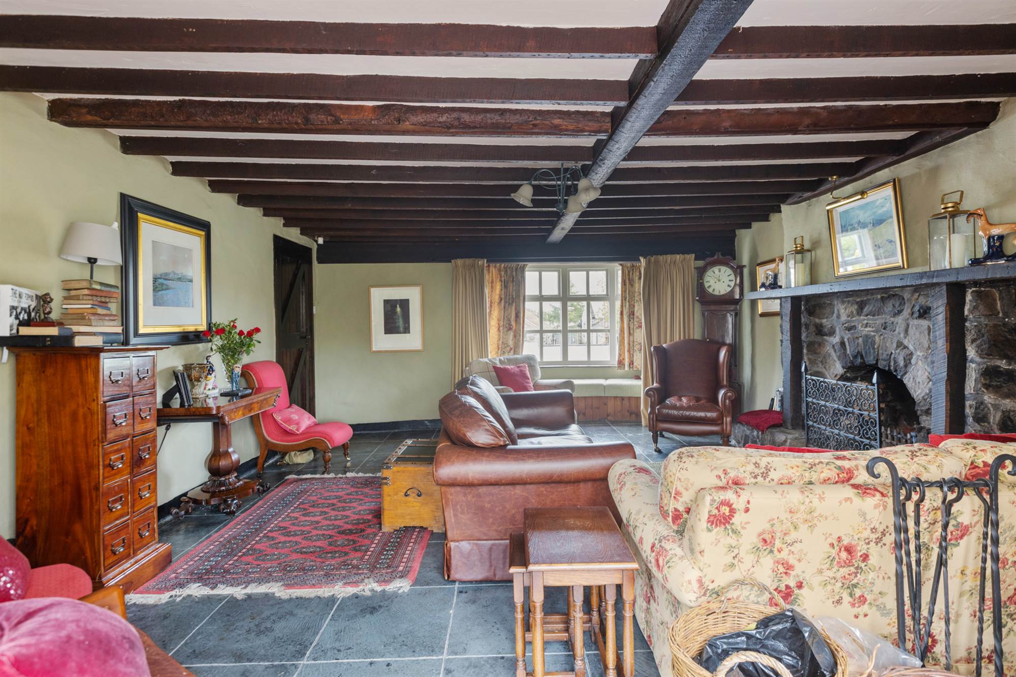 Original stone fireplace with open fire. Exposed beams.