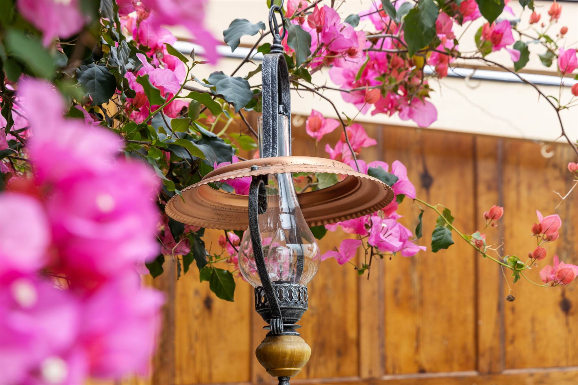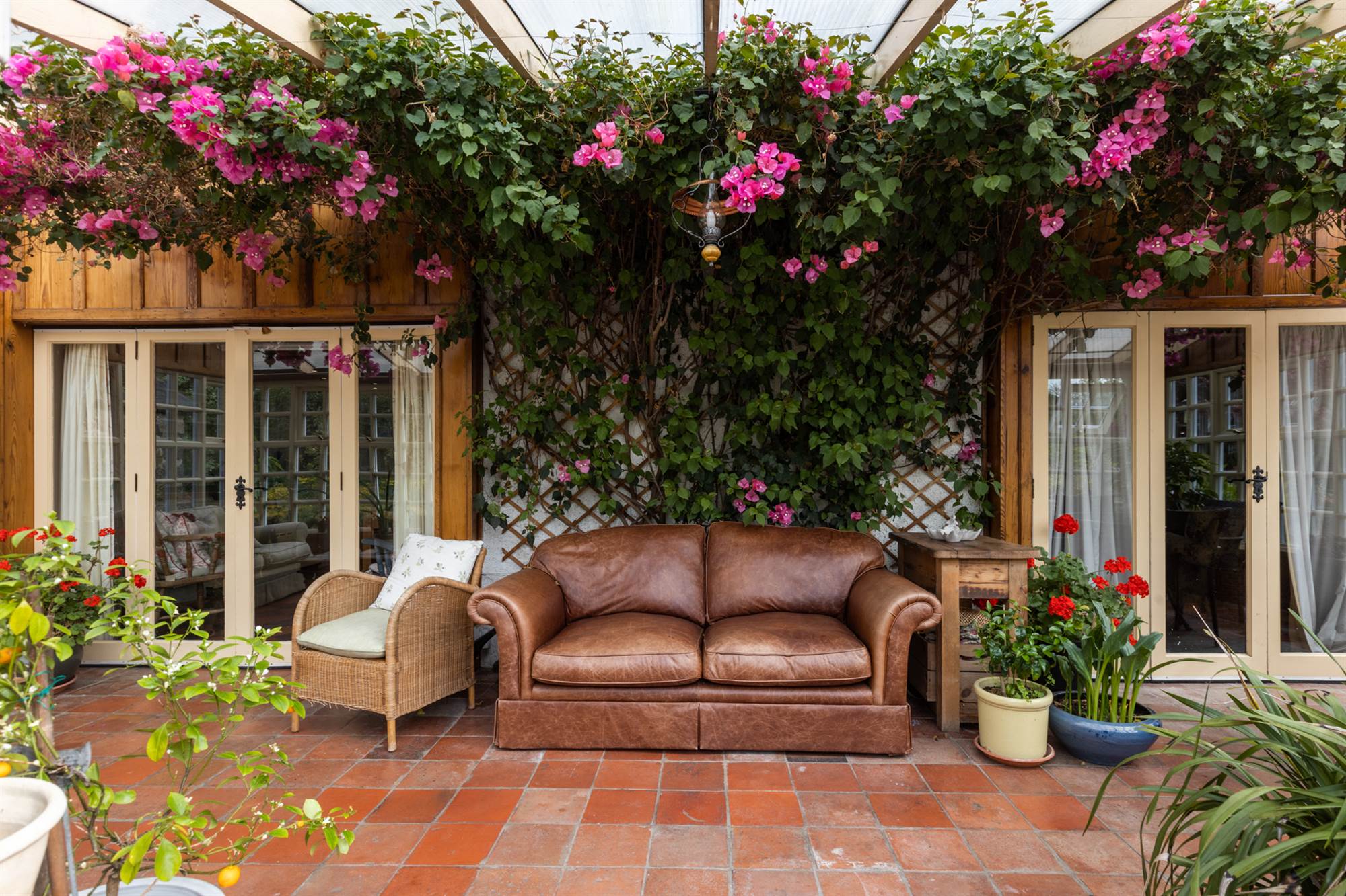 Tiled floor. Access to rear patio. Mature Bougainvillea plant.
