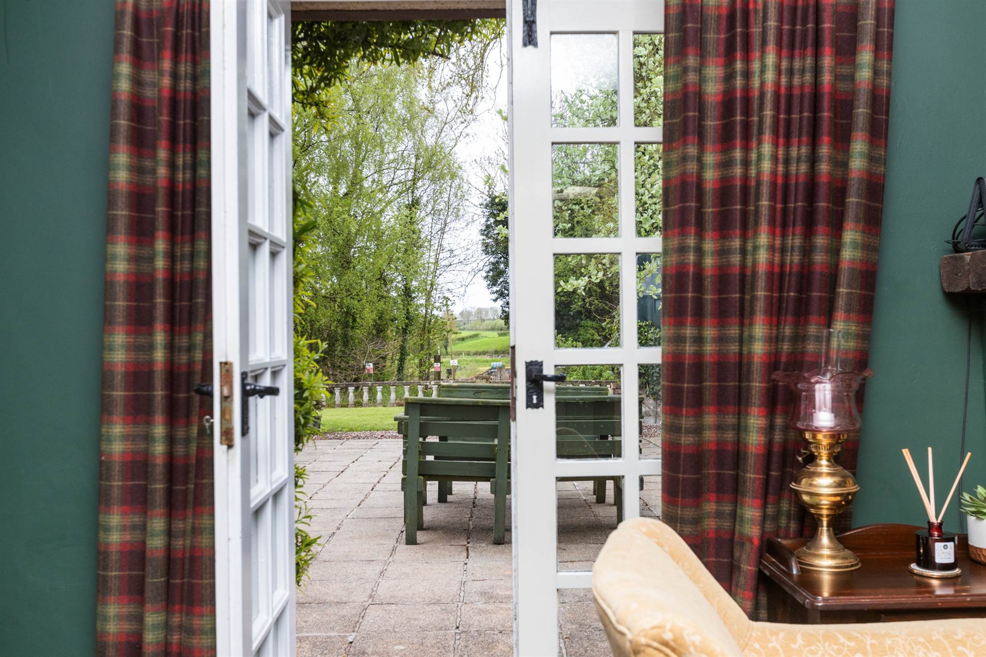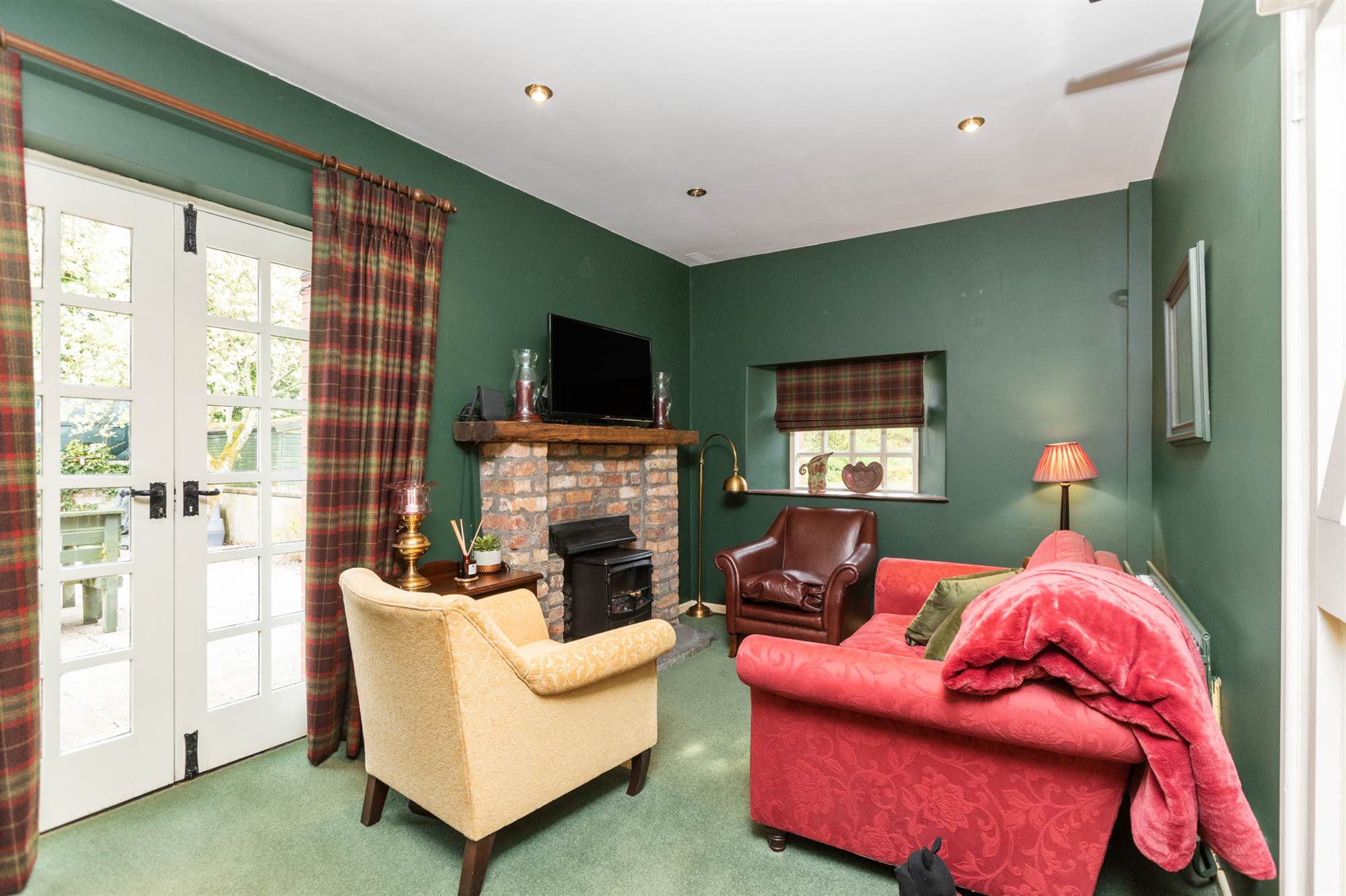 Brick fireplace inset gas fire. French doors leading to patio.