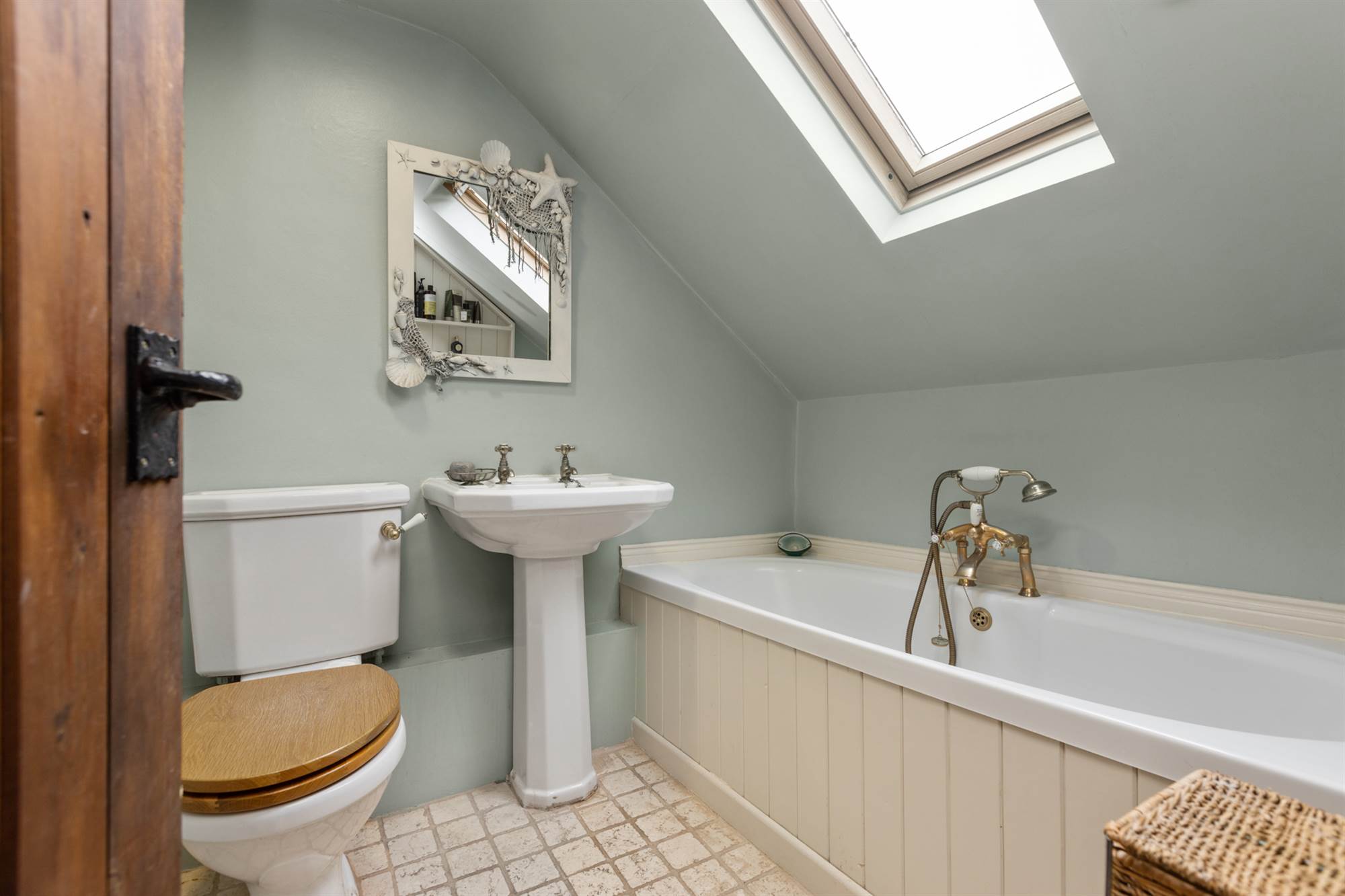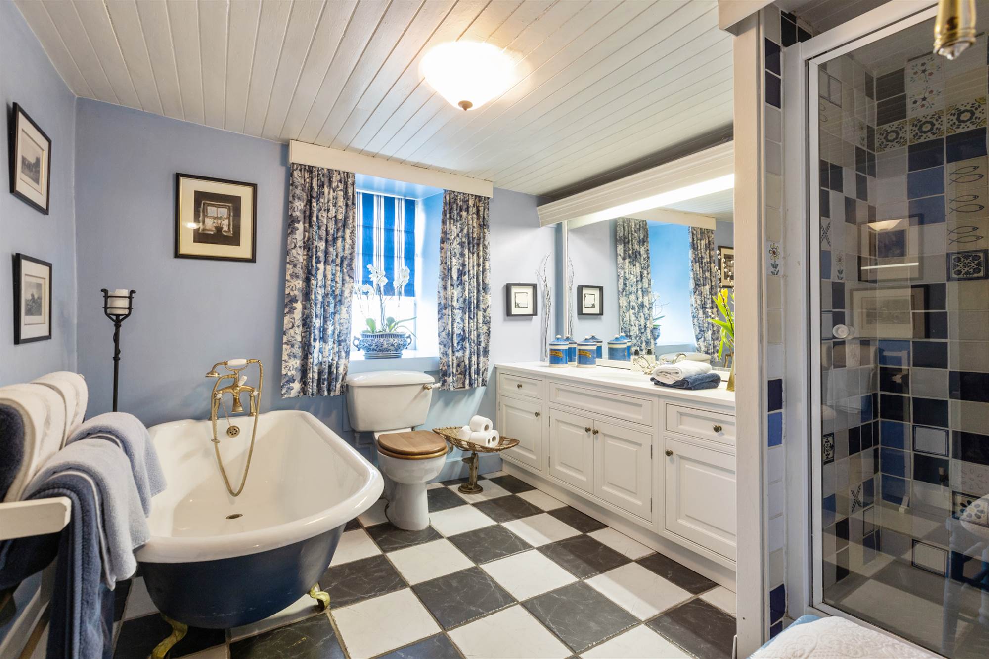 Feature free standing claw and ball foot roll top cast iron bath with telephone hand shower. Separate shower enclosure. Low flush WC. Wash hand basin with vanity unit.