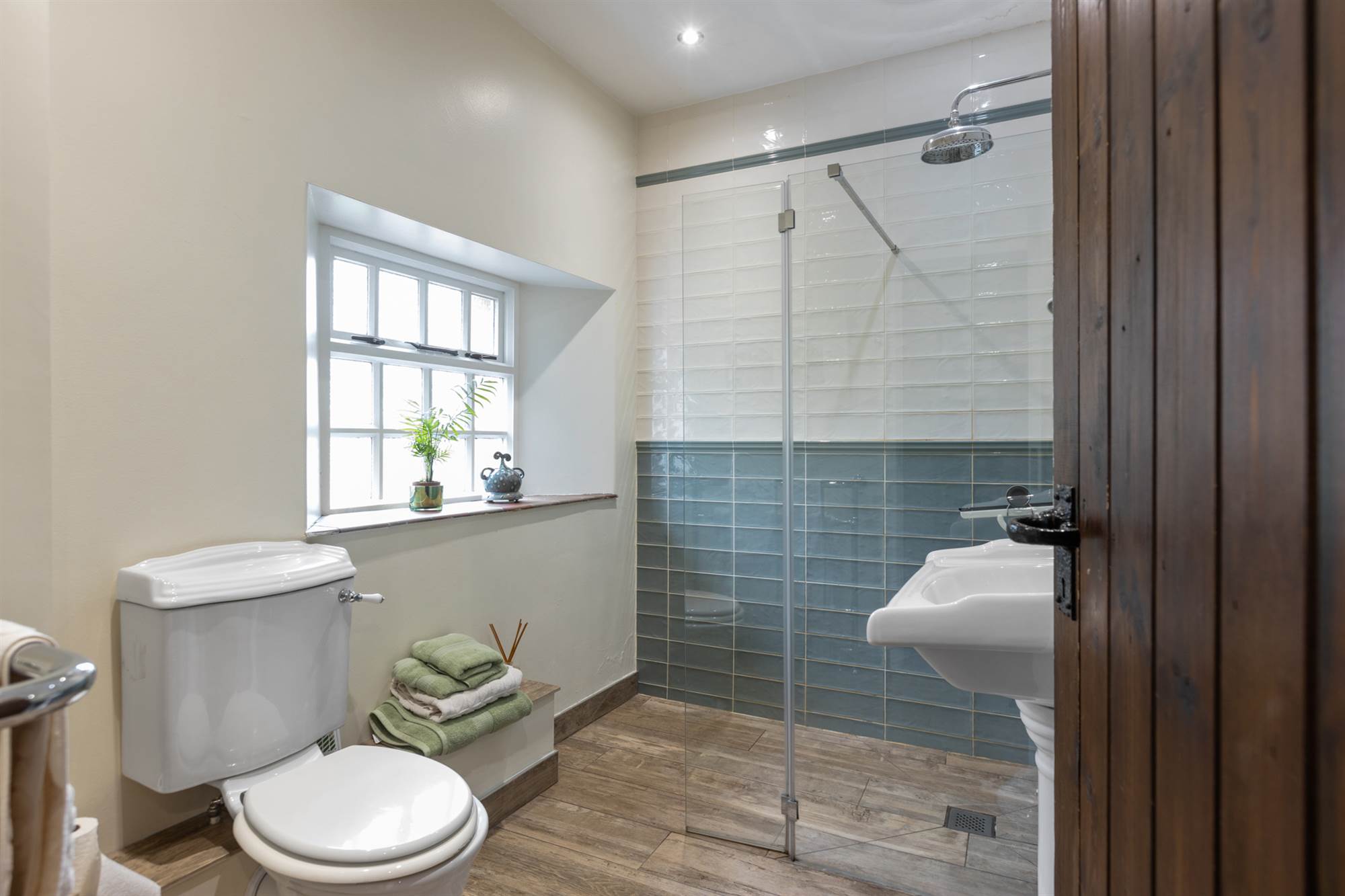 Walk-in-shower enclosure. Low flush WC. Pedestal wash hand basin.
