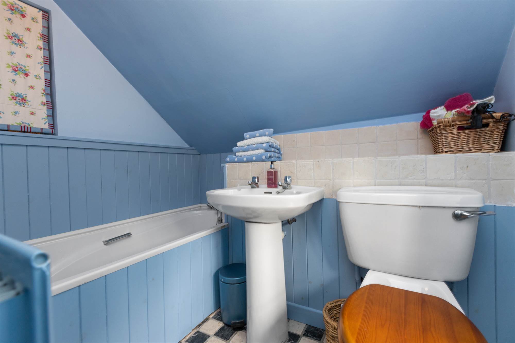 White suite comprising panelled bath with mixer taps. Telephone hand shower. Low flush WC. Pedestal wash hand basin.