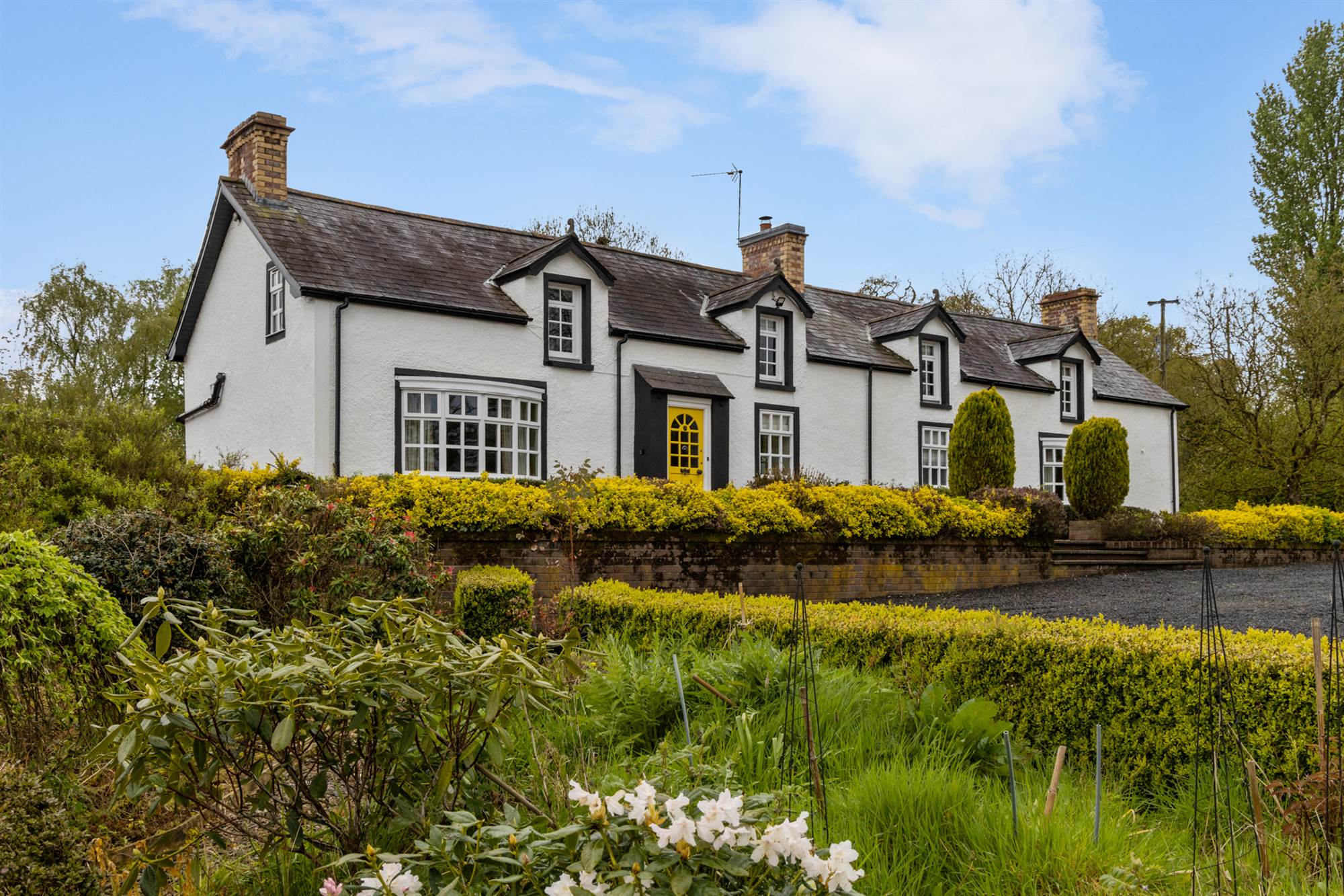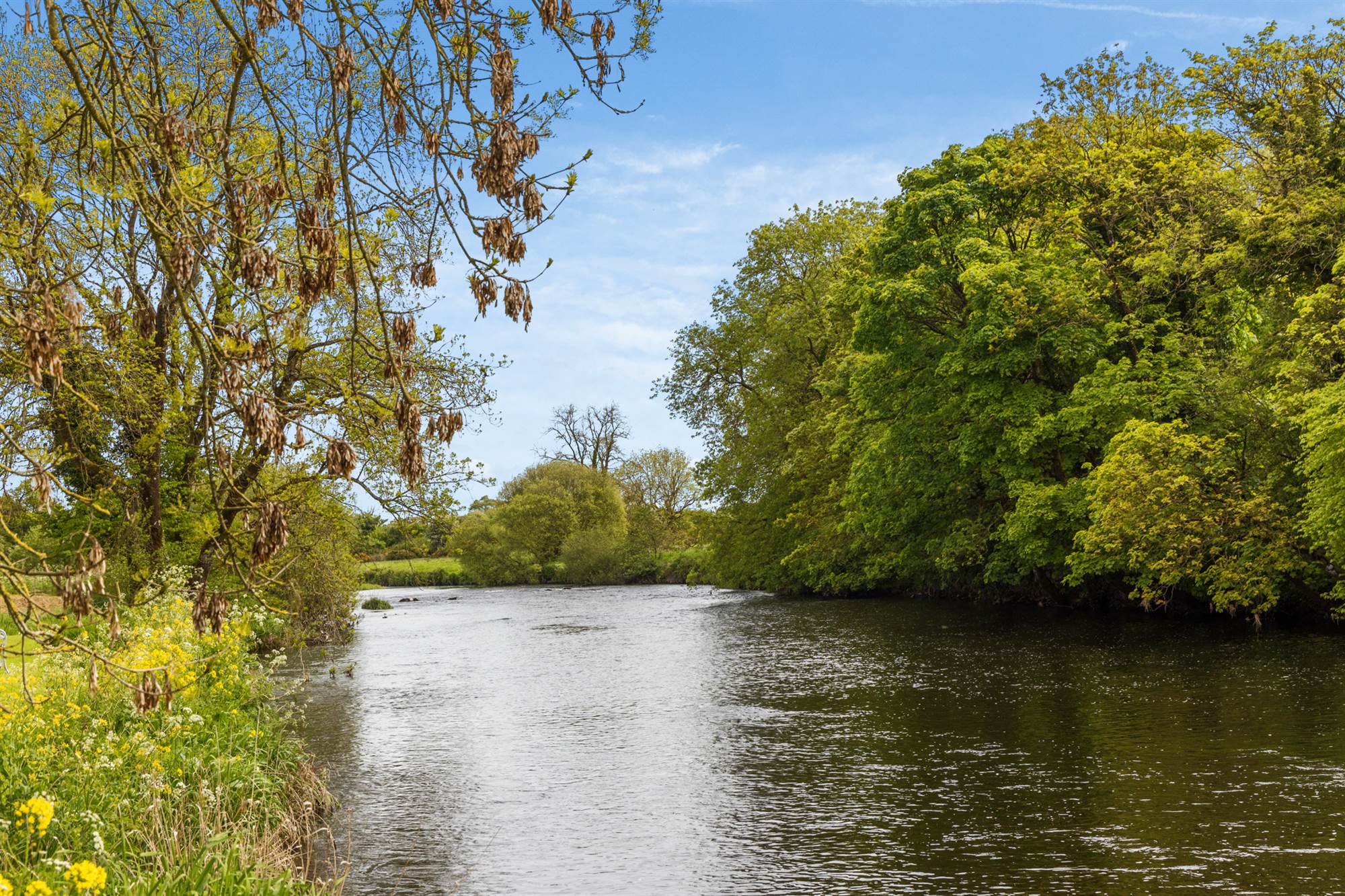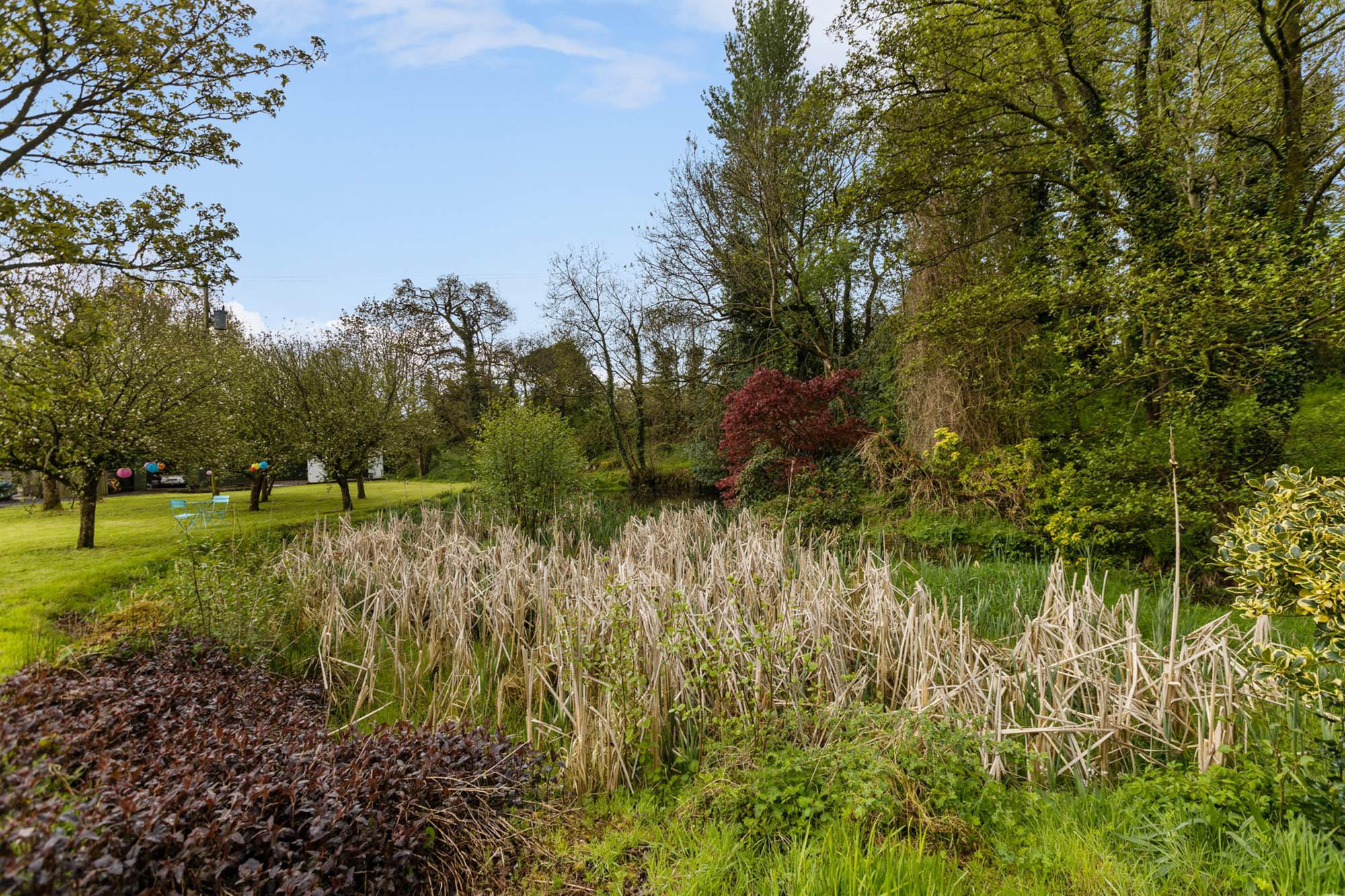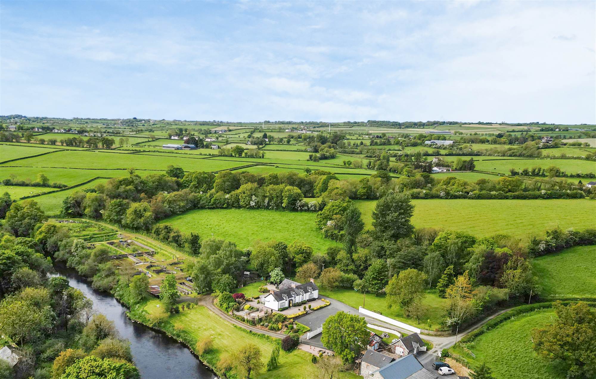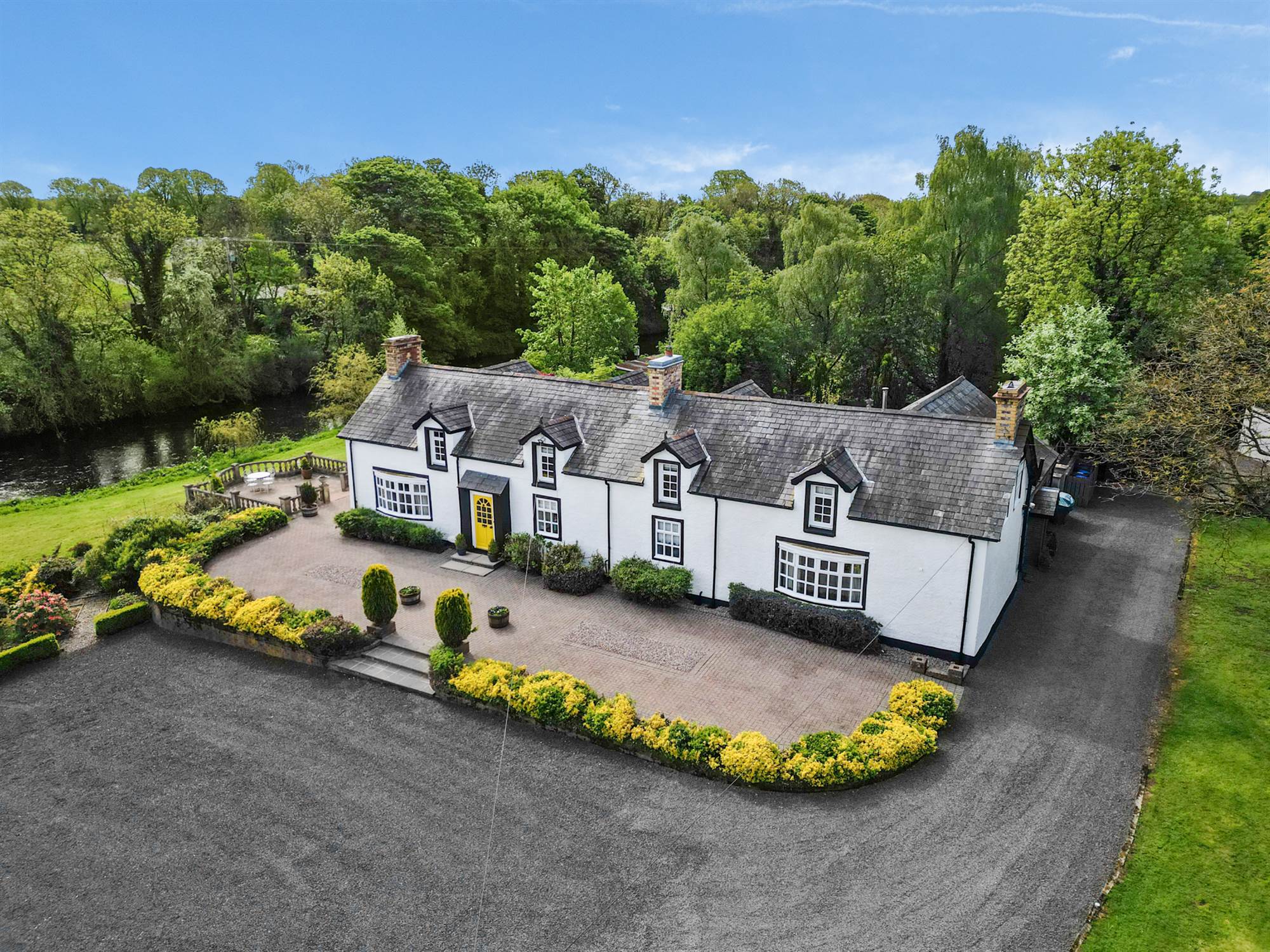 Extensive site extending to 2.5 acres laid predominantly in lawn with patio areas and views over River Maine.