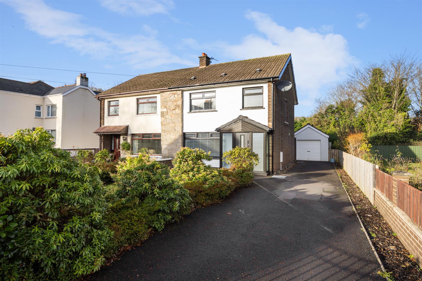 Enclosed landscaped garden to rear in lawn. Detached garage. Front garden in lawn. Large driveway to front providing ample off street parking.