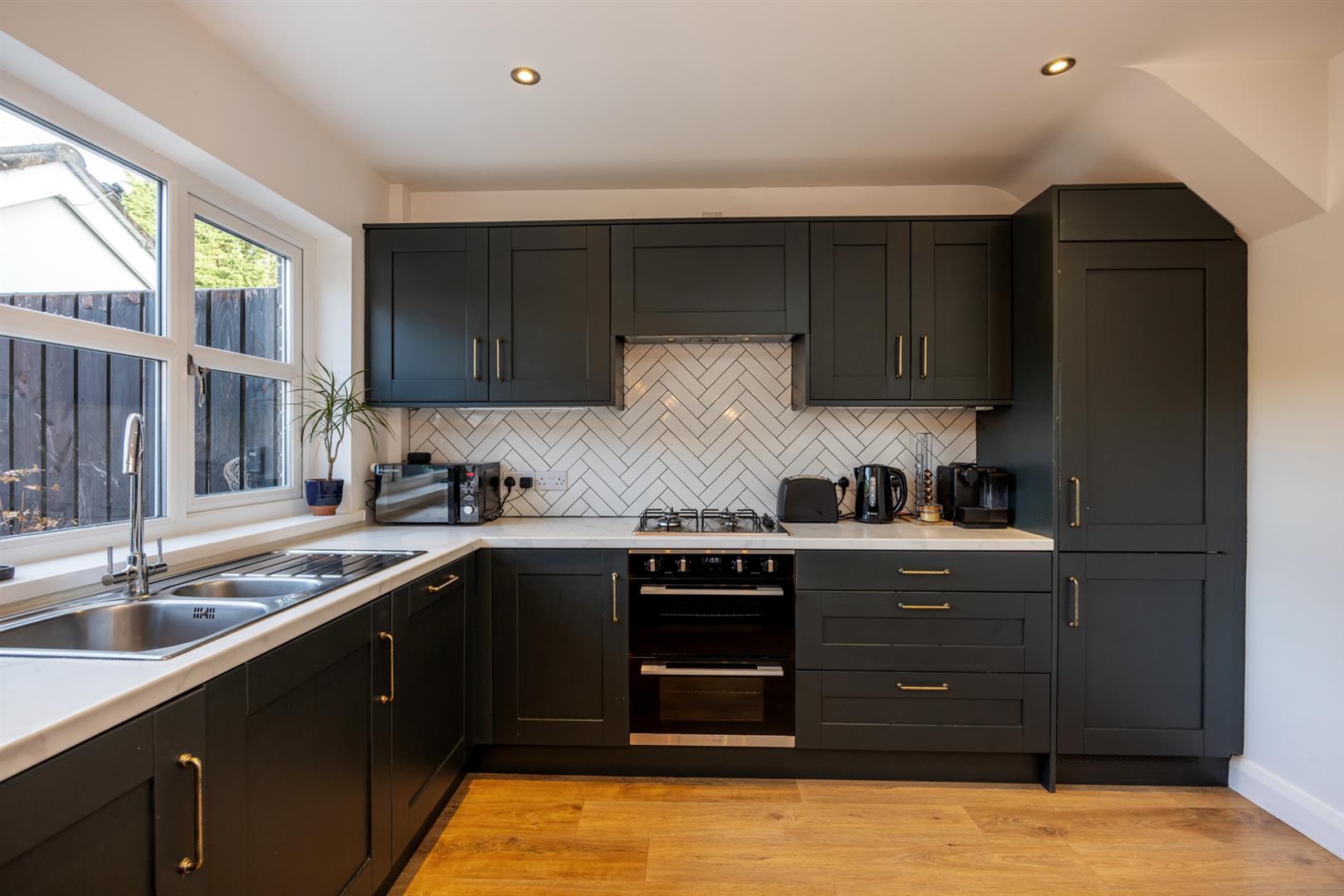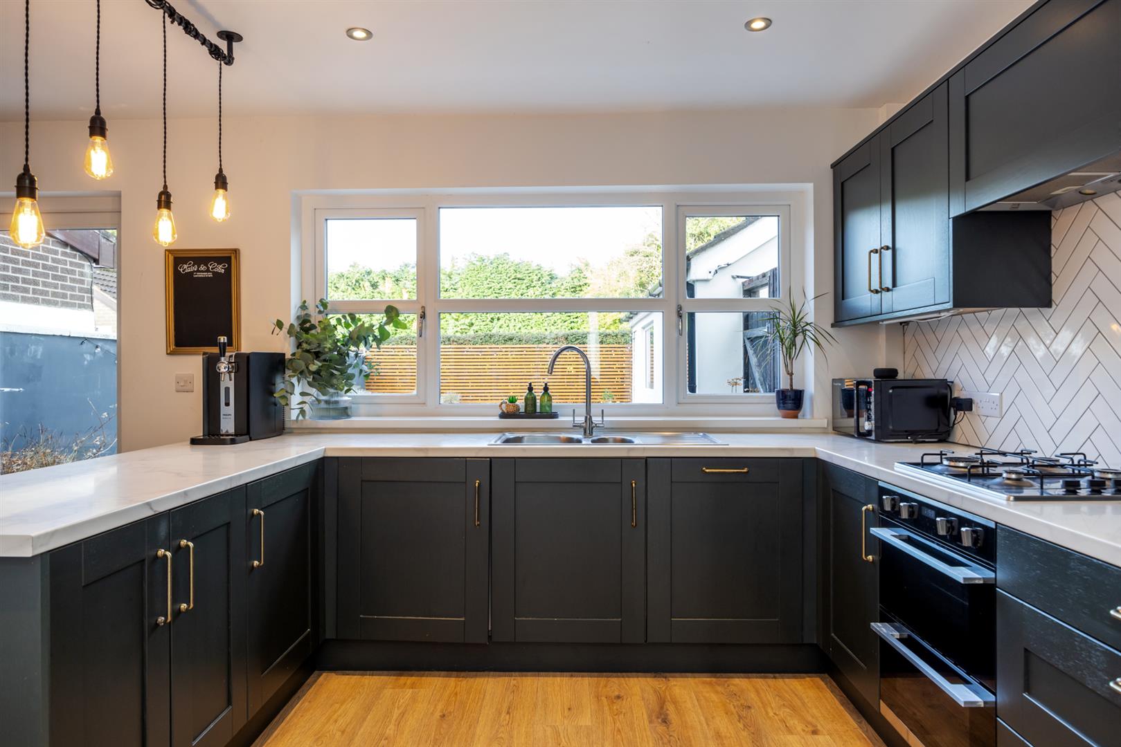 Beautifully fitted kitchen with an extensive range of high and low level units, integrated appliances to include fridge / freezer, dishwasher, washing machine, oven with 4 ring gas hob & extractor fan, 1.5 stainless steel sink unit with drainer & mixer tap, part tiled walls, laminate wood flooring. PVC double doors to enclosed rear garden.
