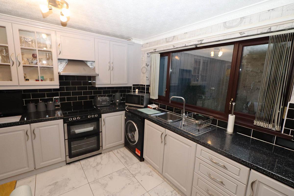 Formica work surfaces, a range of high and low level units, stainless steel sink drainer, space for freestanding hob & oven, stainless steel extractor fan, plumbed for washing machine, part tiled walls, ceramic tiled flooring.