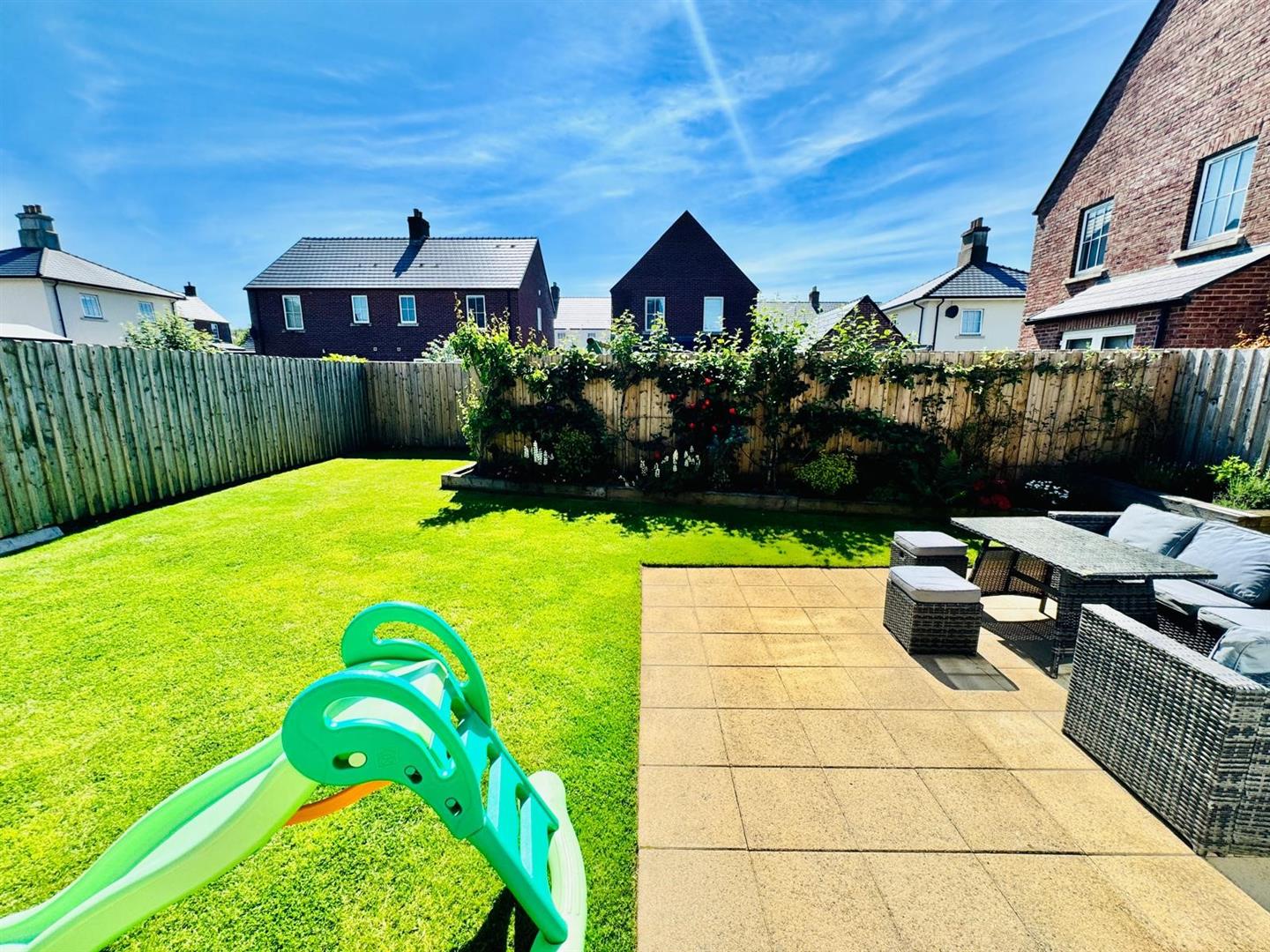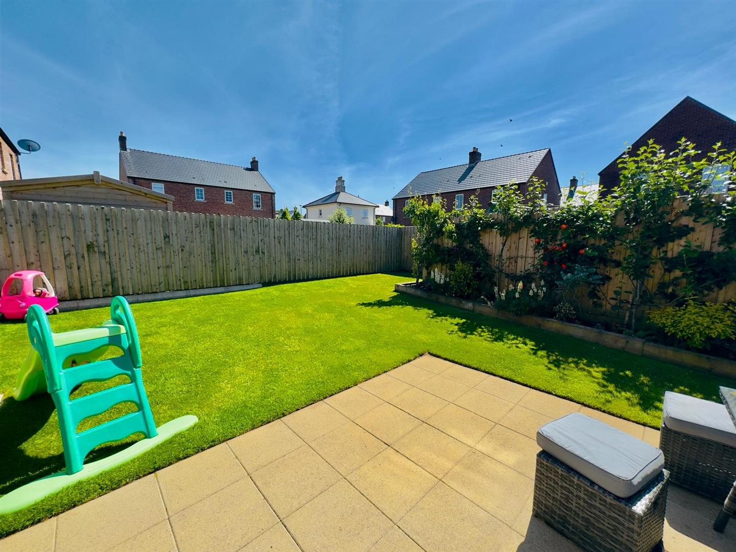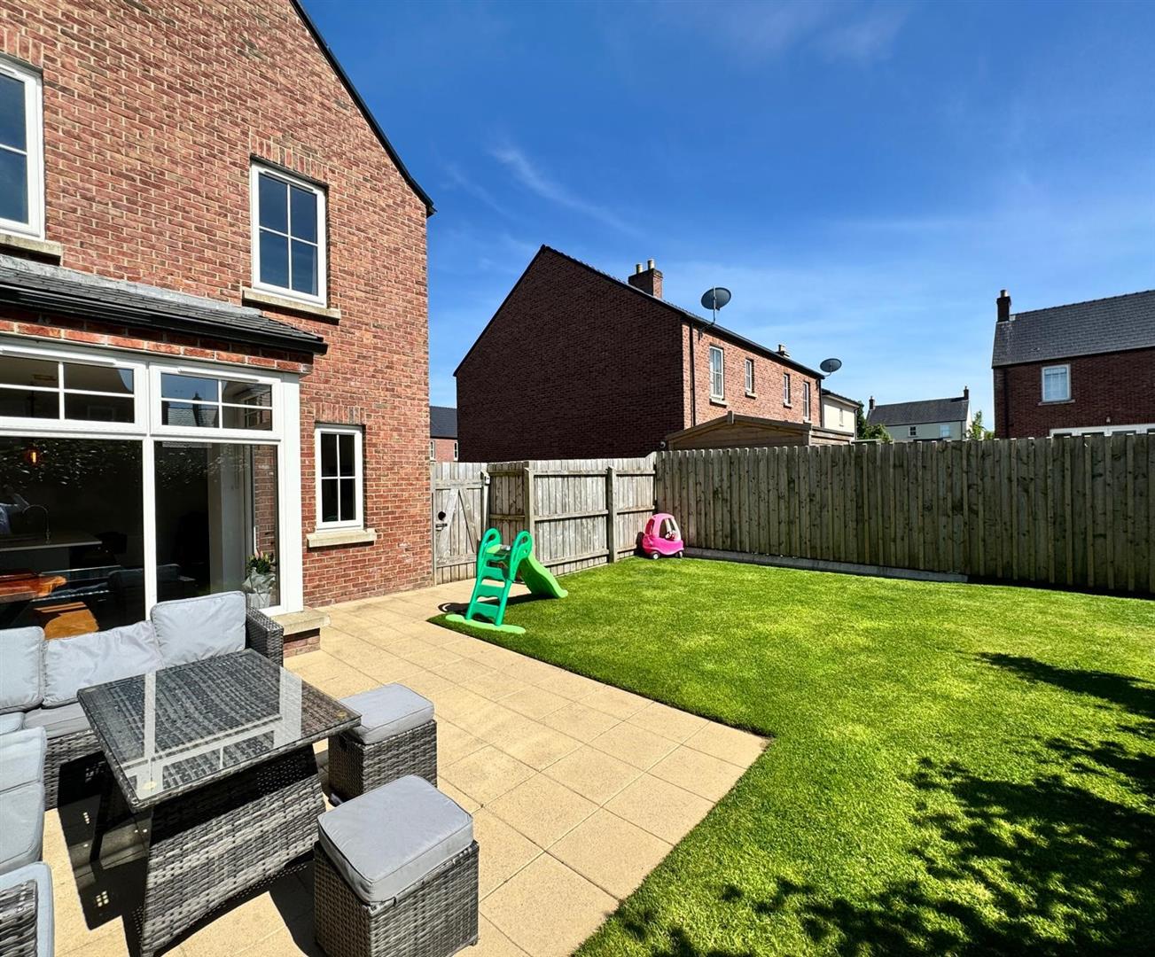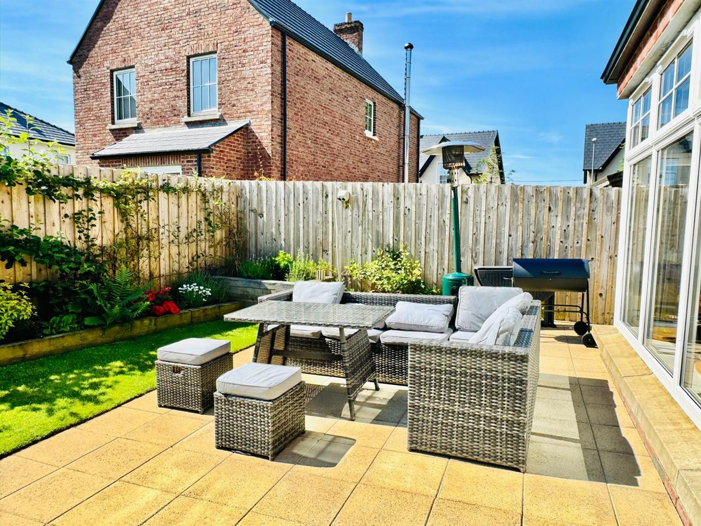 Enclosed garden to rear in lawn with paved patio area, security light and tap.