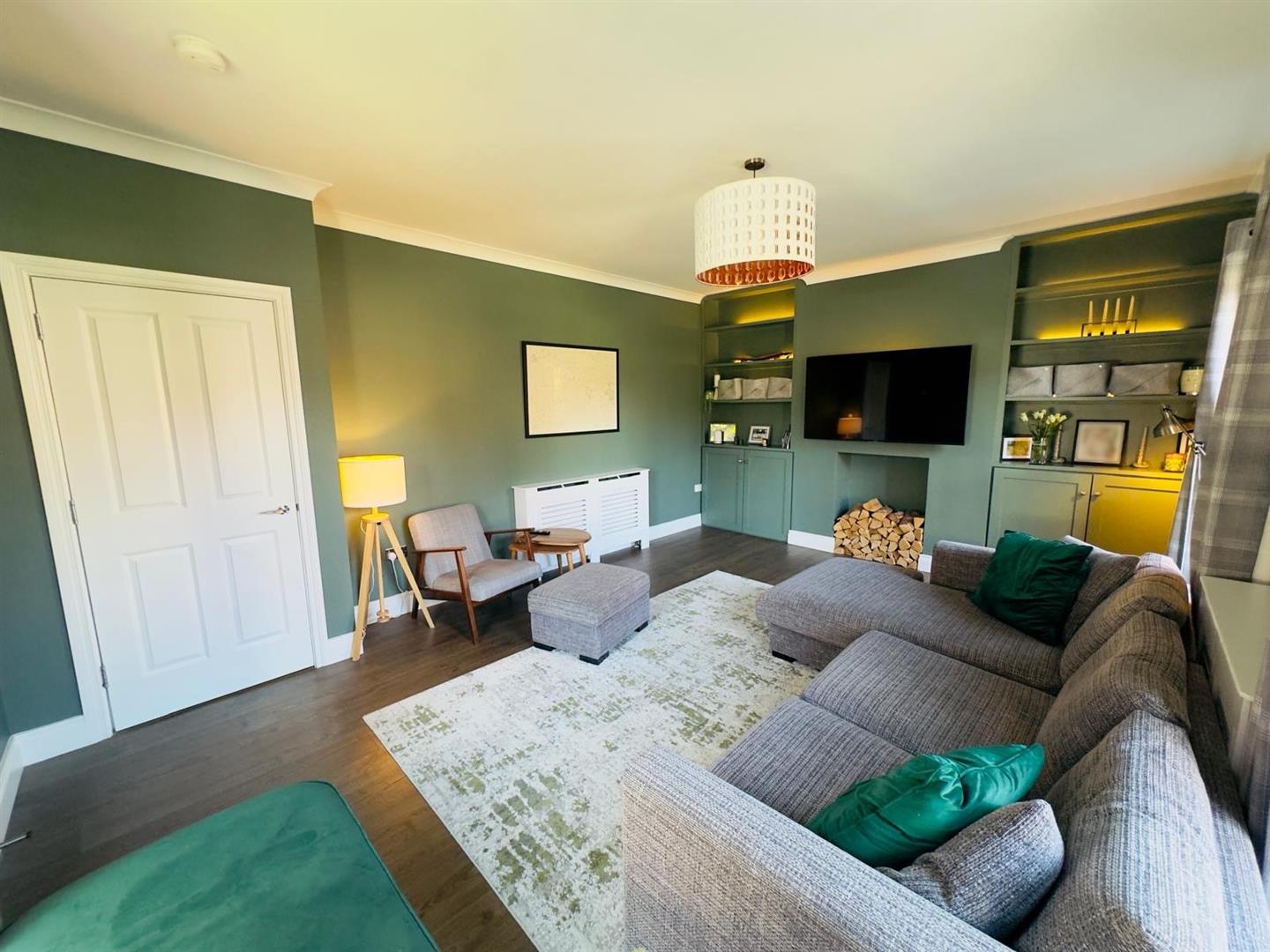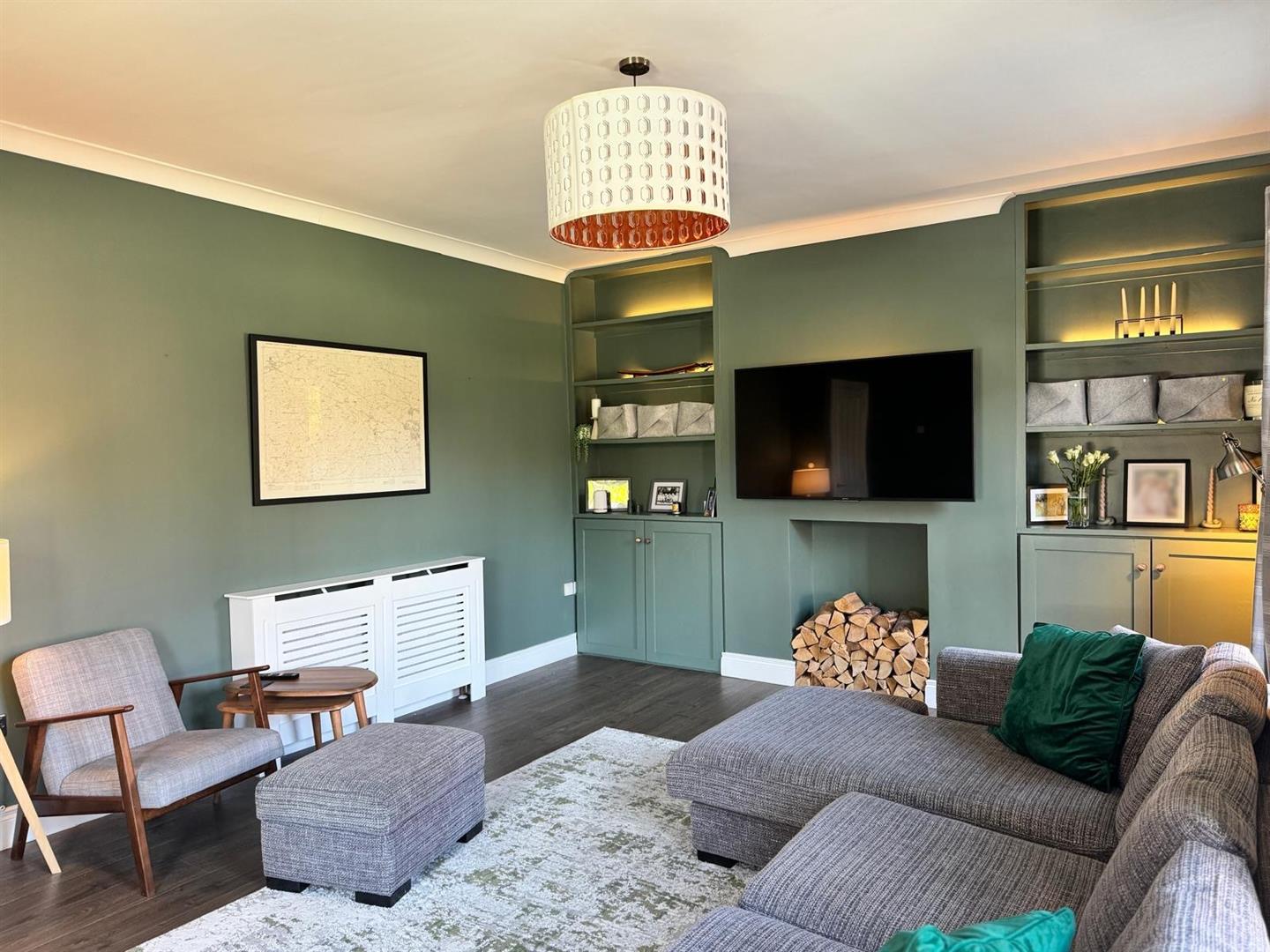 Hole in wall style fireplace, piped for gas fire, bespoke shelving units, hardwood flooring