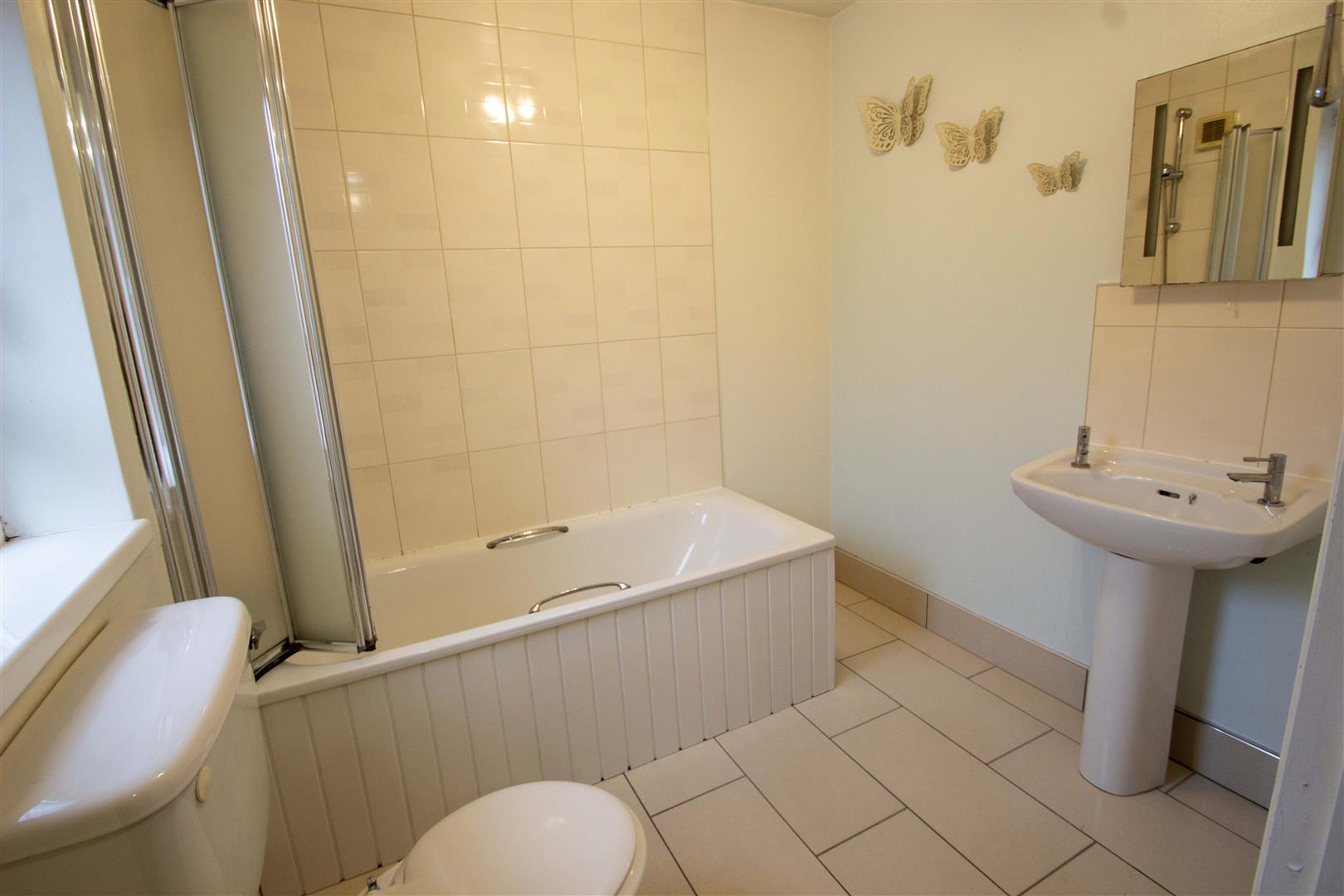 Low flush W.C., pedestal wash hand basin, shower cubicle, thermostatically controlled shower unit, tiling, ceramic tiled floor.